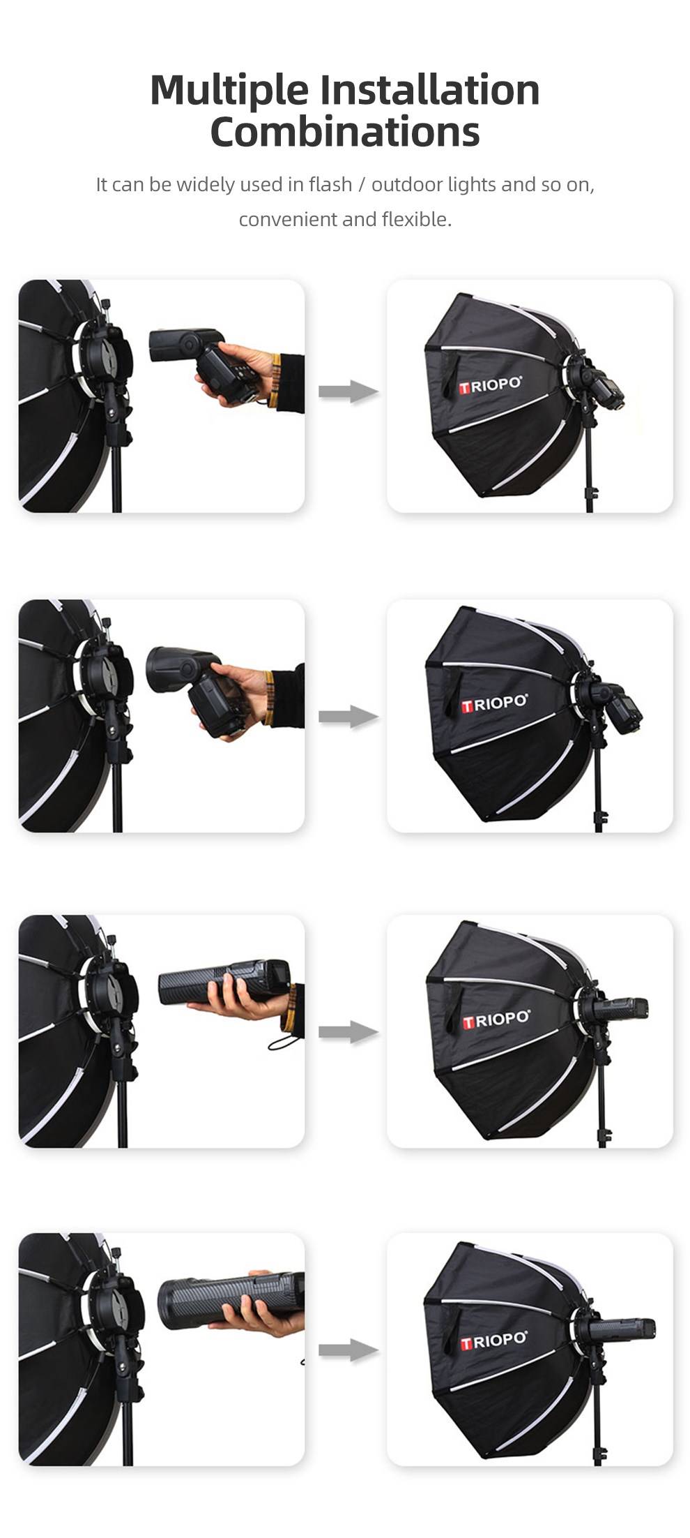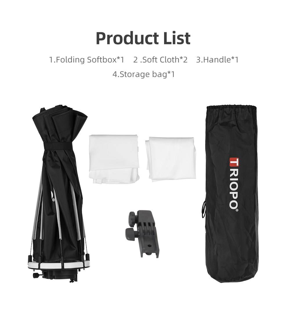 Особенности:Профессиональный, высокого качества 8-полюс 65 см складной восьмиугольный софтбокс.Светильник для вспышки на камере, регулируемый по ширине, подходит для большинства вспышек.Может быть ручной, Ручка регулируется под углом; Может быть установлена на подставке-светильник.Изготовлены из превосходной ткани с тонким мастерством и высокой устойчивостью к изгибам.Светоотражающий серебристый внутренний светильник может минимизировать снижение уровня освещенности.Белая мягкая ткань равномерно смягчает светильник.Поставляется с портативной сумкой для переноски.Совместимость: Вспышка Godox V1Характеристики:Бренд: TRIOPOФорма: восьмиугольникКоличество полюсов: 8Диаметр: 65 см/25,6''Тип крепления: для вспышки на камере светильникЦвет внутренней стороны: серебристыйВес изделия: 565 г/19,9 унцийРазмер посылка: 50*18,5*17 см/19,7*7,3*6,7''Вес посылка: 845 г/29,8 унцийПосылка:1 * восьмиугольный софтбокс2 * мягкая ткань1 * ручка1 * сумка для переноскиПримечание: Не включает сотовую сеткуСовместимость: Вспышка Godox V1Примечание:Вспышка и светильник в комплект не входят