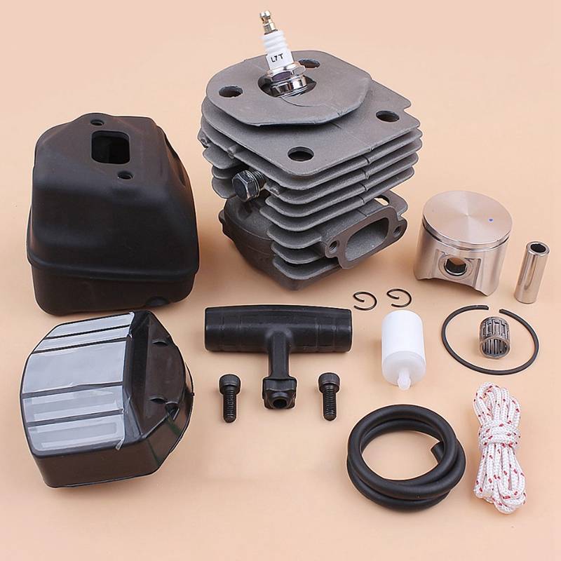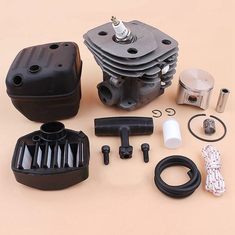 Includes: 1 x Cylinder, 1 x Cylinder Plug, 1 x Piston, 1 x Pin, 1 x Ring, 2 x Retaining Ring, 1 x Bearing, 1 x Muffler, 2 x Screws, 1 x Muffler Spacer, 1 x Air Filter, 1 x Spark Plug, 1 x Fuel Hose, 1 x Fuel Filter, 1 x Starter Handle, 1 x Starter Cord