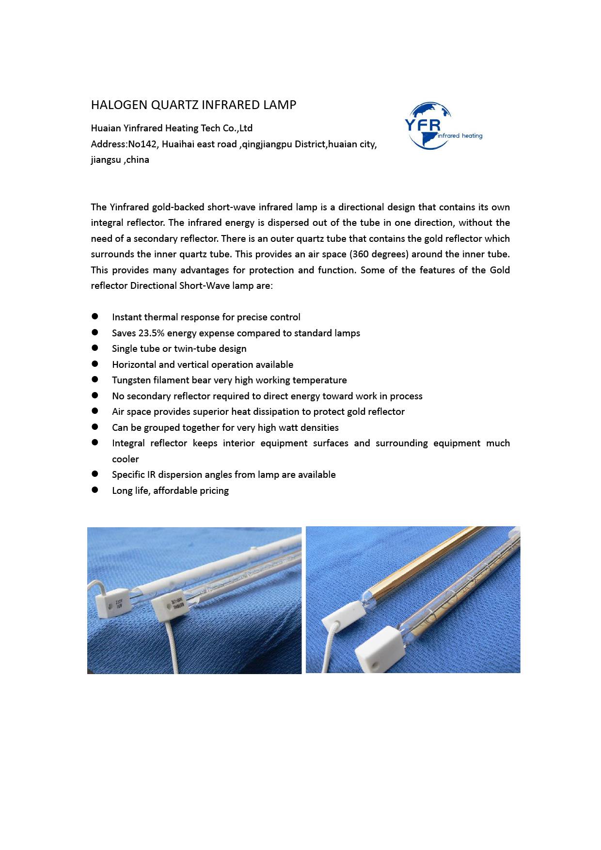 Huaian yinfrar предназначен для обеспечения высокого качества двойной трубки Кварцевые инфракрасные лампы на рынке. Мы производим средне-волновые, быстрые средне-волновые и двухволновые трубные лампы как в 23 мм x 11 мм, так и в 33 мм x 15 мм кварце. Наши лампы могут быть изготовлены с высокотемпературным отражателем белого оксида, с высокой эффективностью 23K золотого рефлектора или без кварца.