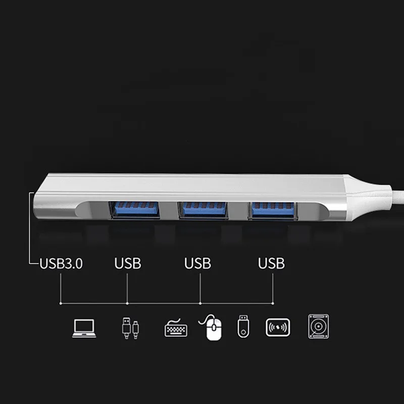 Подходит для usb-порта компьютера и другого оборудования, стандартная версия USB3.0 5 Гбит/с Высокоскоростная передача, может на самом деле USB2.0 многопортовое расширение, например: мышь, Подключение клавиатуры, Подключение периферийных устройств, зарядка через usb-порт к мобильному телефону и другим многопортовым точкам.
