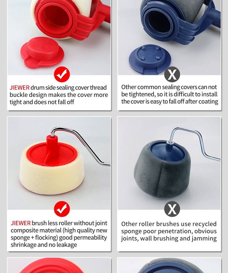 1. Опора ролика принимает новые пластиковые материалы. Материал утолщен, чтобы предотвратить деформацию и перелом. Другие общие опоры-переработанный пластик легко деформируется, ломкий и легко ломается 2.JIEWER новый материал изготовления стенной чистки костюм материалис утолщенный и видимый Другие Наборы для чистки стен перерабатывают пластик сравнимый вес с первого взгляда 3.JIEWER боковая уплотнительная крышка с резьбой с пряжкой делает крышку более плотной и не отпадает Другие общие уплотнительные крышки не могут быть затянуты, поэтому трудно установить крышку легко отвалиться после покрытия 4.JIEWER щетка без ролика без соединения композитного материала (высокое качество новая Губка + Флокирование) хорошая проницаемость усадка и отсутствие утечки Другие Роликовые щетки используют переработанную губку плохого проникновения очевидных соединений, чистку стен и помех 5.JIEWER кронштейн для разделительной щетки с внешней вставкой полностью решает проблему капель Другая раскладочная кисть поддерживает вставку в место хранения шкурки, закрепленные с помощью отвертки, краска легко удаляется из зазора 6.JIEWER длина роликовая щетка удлинительная штанга регулируется до 1,1 м проще краски ввысокая места Другие обычные роликовые щётки, как правило, имеют длину около 40 см и не могут удовлетворить все требования