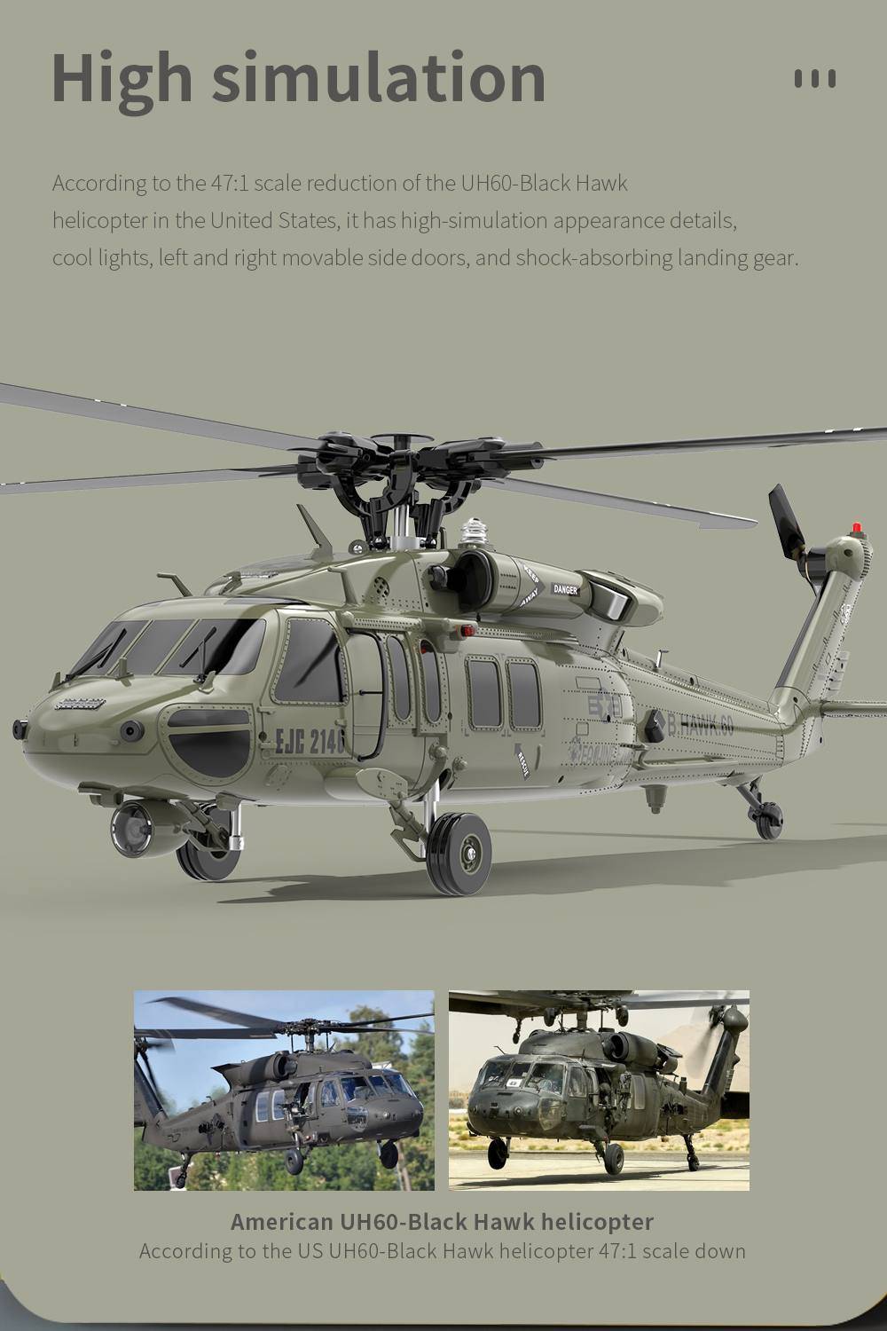 1> сделан в соответствии с 47 (Европа): 1 весы уменьшение UH60-Blackhawks вертолет в Соединенных Штатах, он имеет Высокая реалистичность внешнего вида детали, холодный свет, влево и вправо, подвижный боковой двери, амортизирующие шасси.