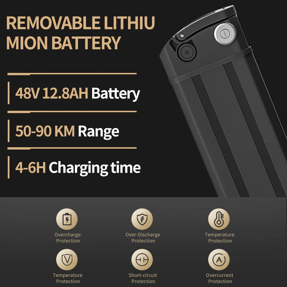 Ma bateriajlitową 18650 mocy i 14AH wystarczajój mocy, moc elektryczna mozye trwaic do 90km.