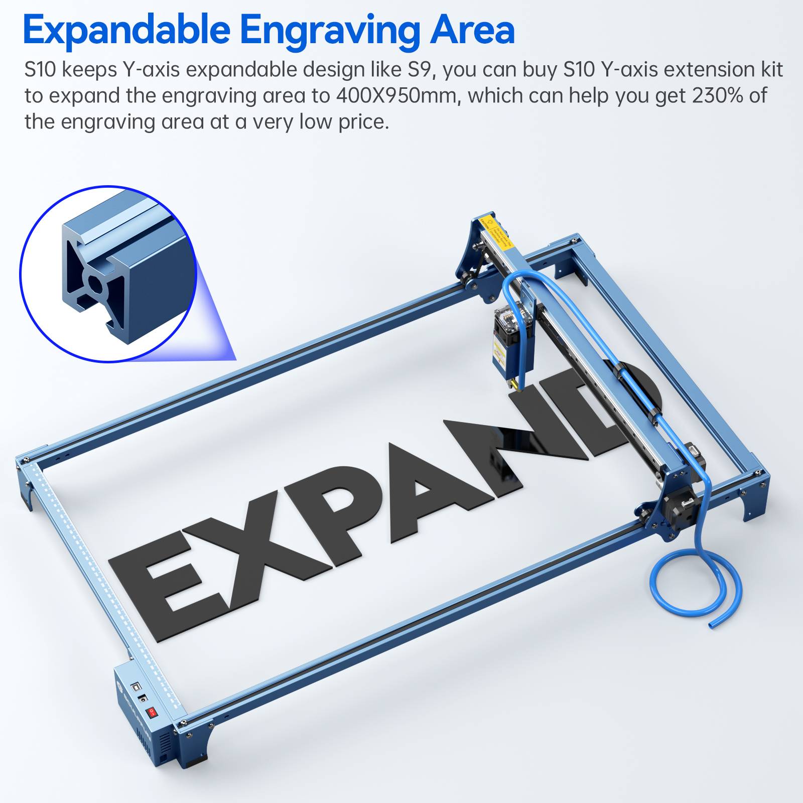 6. Расширяемая Площадь Гравировки: S10 сохраняет Y-axis расширяемый дизайн, как S9, оригинальная Площадь Гравировки составляет около 400x400 мм, но вы можете купить набор для продления оси S10 для расширения площади гравировки до 400X950mm, что поможет вам получить 230% площади гравировки по очень низкой цене. Это поможет вам лучше справиться с гравировкой или резкой большой площади.