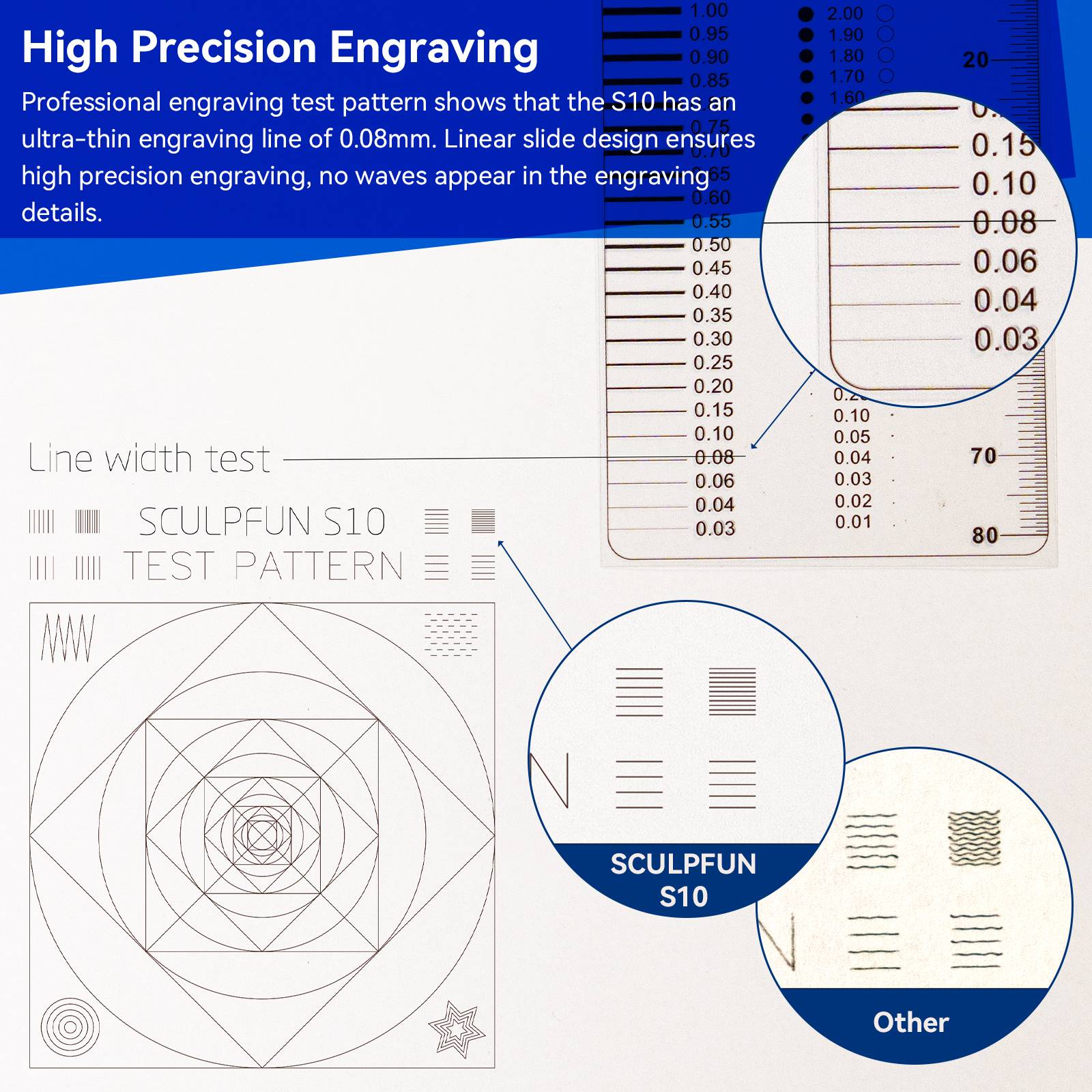 4. Точность резки промышленного класса: S10 принимает промышленные высокоточные линейные направляющие X-axis, что делает его получить точность гравировки промышленного класса. При сравнении небольших гравировальных деталей S10 не имеет волновых линий, на которых появляются другие обычные гравировальные машины.