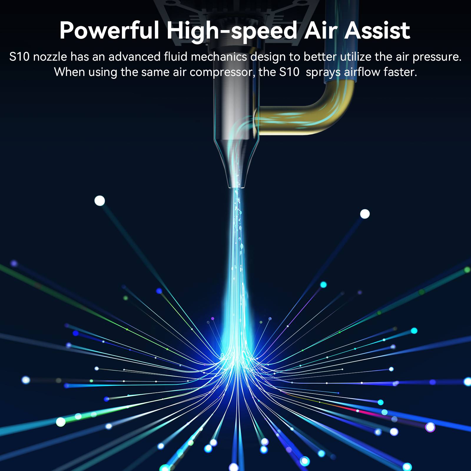 1. Мощная высокоскоростная воздушная помощь: S10 оснащена высокоскоростным воздушным вспомогательным соплом. Разница этого сопла заключается в том, что он имеет передовую механическую конструкцию жидкости, чтобы лучше использовать давление воздуха. При использовании того же воздушного компрессора, распылитель S10 быстрее пропускает воздух. Например, при использовании 30L/мин, 0.03Mpa воздушный компрессор, S10 насадка будет брызгать высокоскоростной воздушный поток до 14,5 м/с. Это значительно улучшит проникновение и эффективность резки.