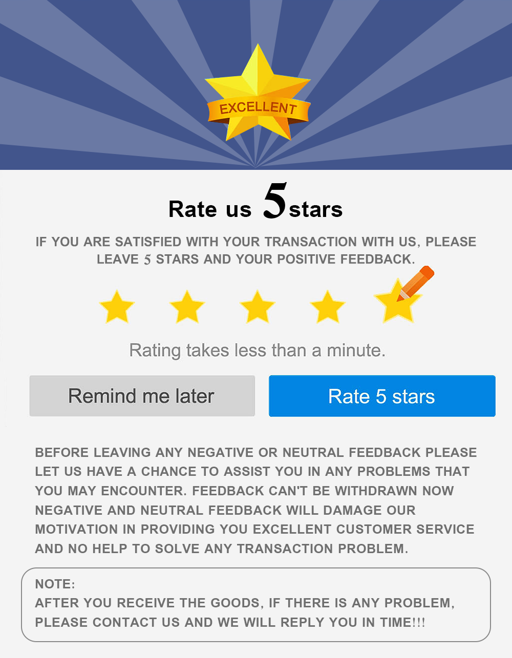 5. Примечание покупателя: Пожалуйста, попросите нас продлить время получения товара, если вы не получили ваш товар вовремя. Спасибо за сотрудничество.