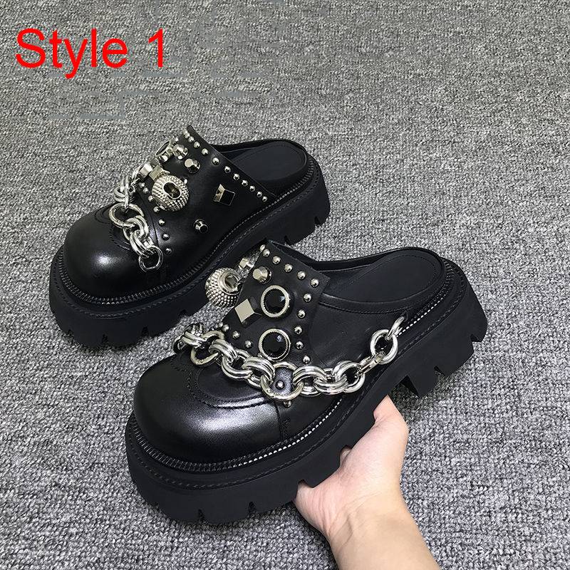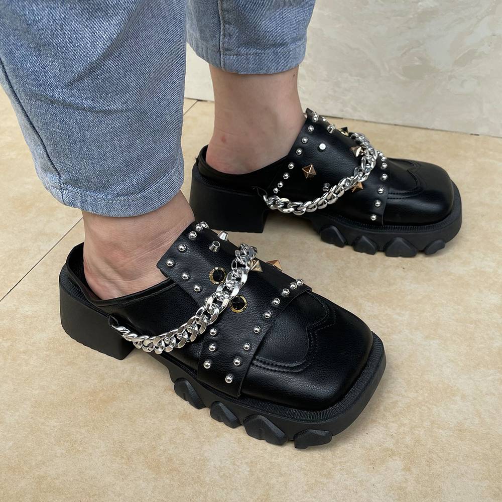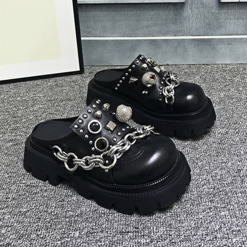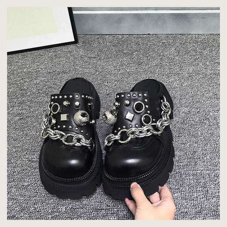 Летние женские кожаные тапочки на платформе 5 см, панк, хип-хоп, тапочки с металлическими декоративными цепочками, женские черные шлепанцы на толстой подошве