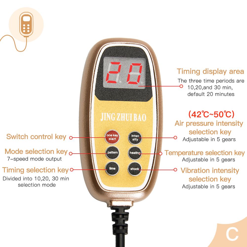 ⑦Клавиша выбора режима: режим делится на семь режимов выхода, а именно: давление воздуха + нагрев + вибрация, давление воздуха + нагрев, нагрев + вибрация, давление воздуха, нагрев и вибрация, нажмите клавишу, чтобы выбрать выходной режим в свою очередь.