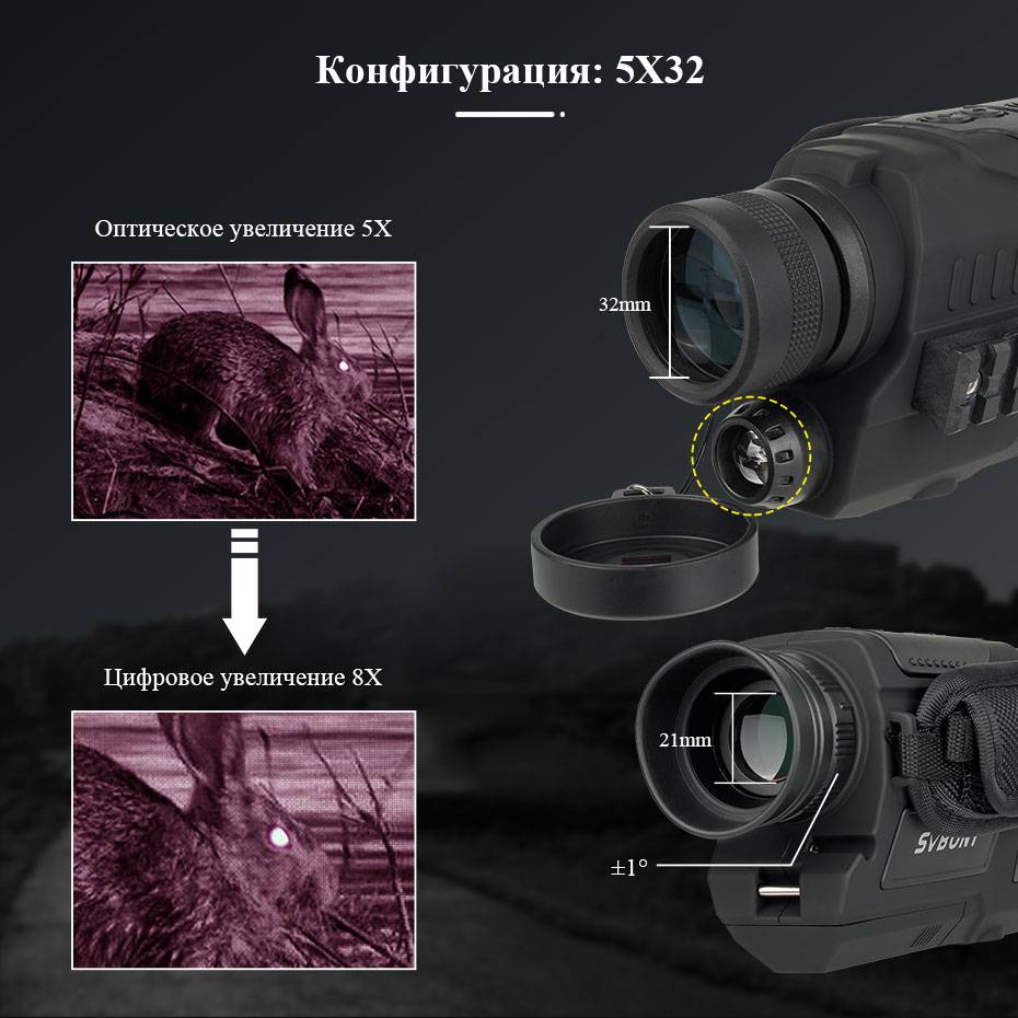 Название брендаsvbonyНомер моделиSV52 Night Vision MonocularПроисхождениеКитайЕдиница измерения100000015Количество1Objective Lens Diameter32mmOptical Zoom5xDigital Zoom8xInfrared Illuminator Wavelength850 umViewing distance in low light2m~Screen resolution640x480Viewing distance in total darkness0~200mSensor Size1/3" CMOSLCD Size1.5"Field of ViewHorizontal 3.75 degree;FOV:5 degreemonocular binocularscamping hiking