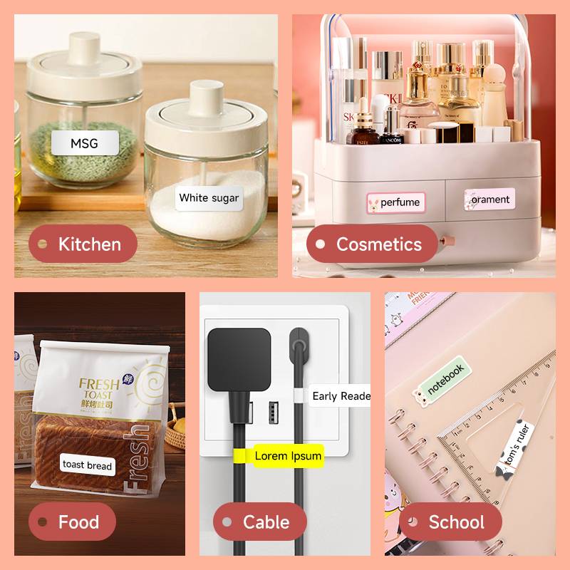Домашнее использование, коммерческое использование (кухонное хранилище, домашняя организация, логотип переключателя, этикетка имени, логотип продукта матери и ребенка, классификация офисных документов, этикетка продукта, Этикетка ювелирных изделий, этикетка даты и т. д.)