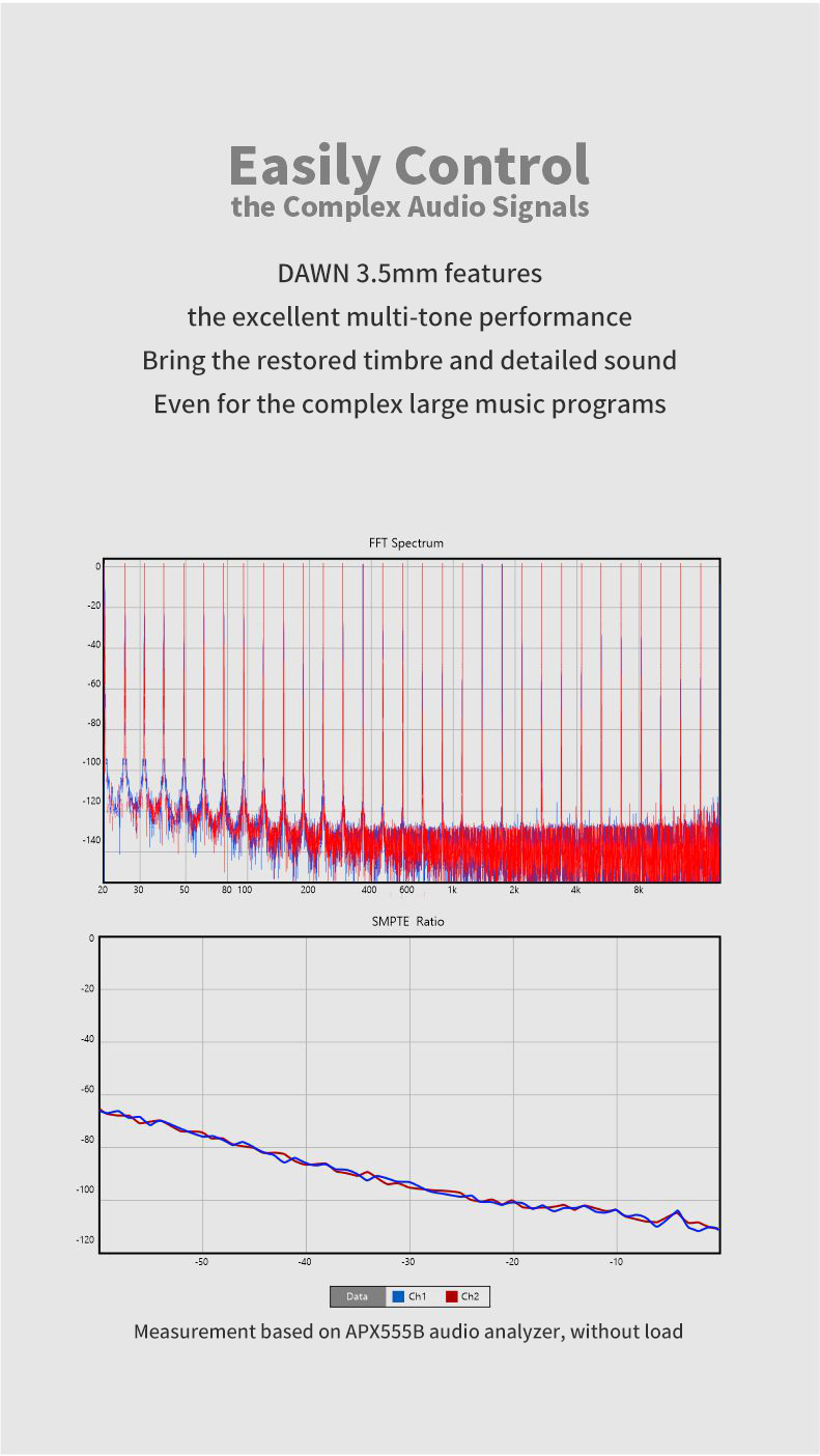 DAWN использует двойной чип декодирования высокой производительности CS43131, а Полностью сбалансированное декодирование с полным соединением выполняется через четыре канала, что обеспечивает супервысокую производительность за пределами теоретической ценности чипа. Кроме того, он оснащен максимальной мощностью 4Vrms и обеспечивает до 230 МВт неискаженную мощность при 32Ω, он помогает легко управлять всеми видами наушников.