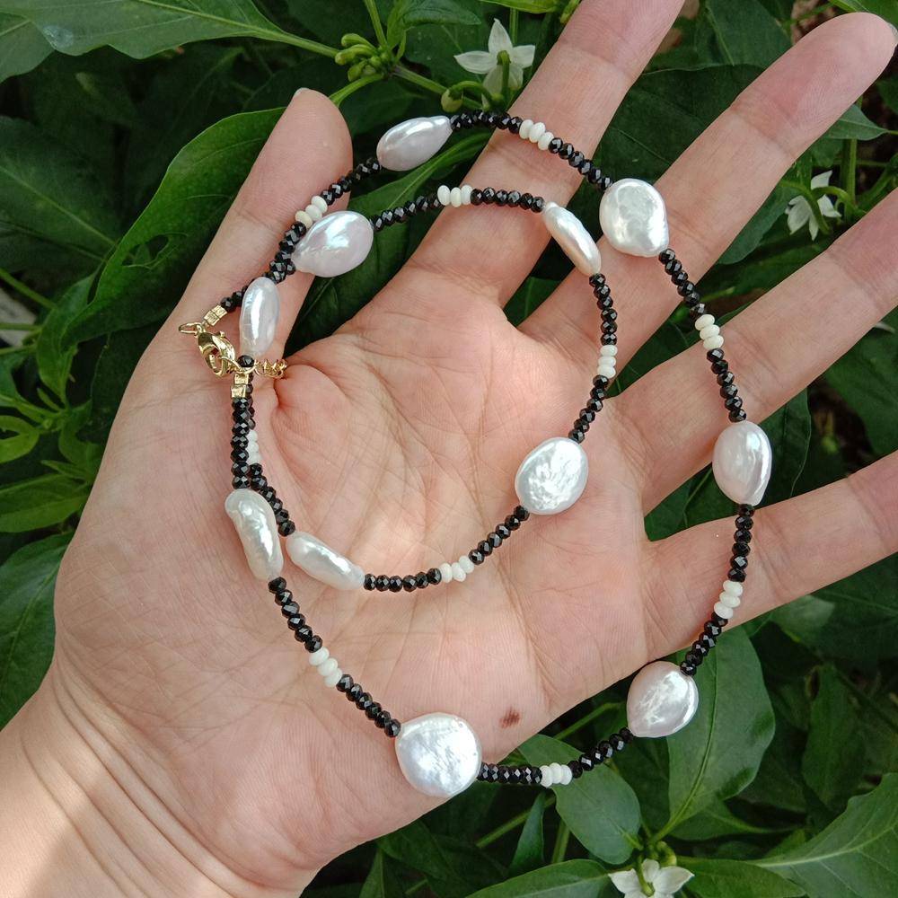 Gems info: natural black spinel, freshwater cultured white coin pearl.
