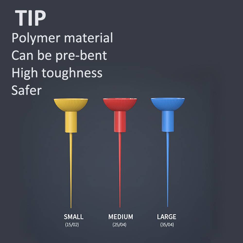 Гарантия безопасности-Наконечники иглы изготовлены из мягкого полимерного материала, он может легко обойти изогнутую часть в корневом канале для поддержания целостности прямого канала. Также может уменьшить риск поломки или повреждения внутренней стороны корневого канала.
