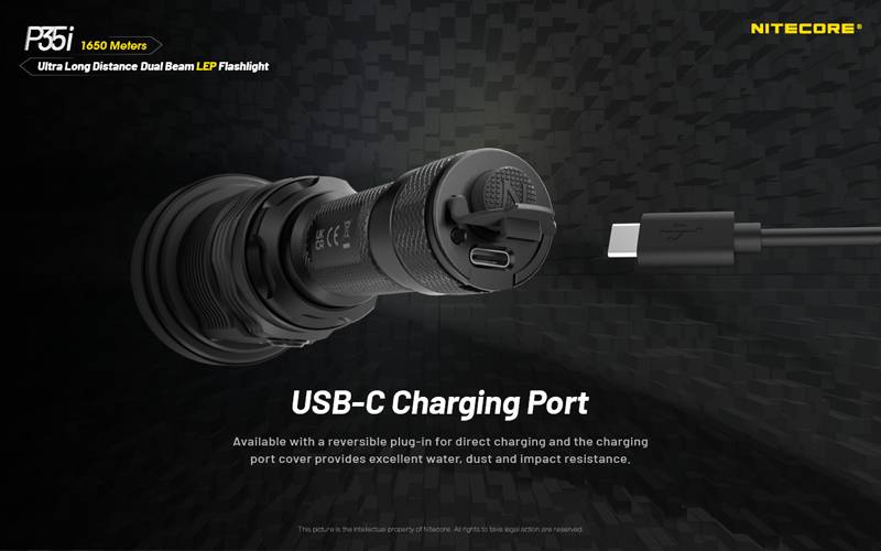 P35i питается от аккумулятора высокой емкости 5000 мАч. Его можно заряжать напрямую через USB-C порт на задней части фонарика. Встроенная Сторона P35i-это oled-панель, которая дает вам подробные показания уровня заряда батареи, время работы, индикации режима и многое другое. Защищенный USB-C порт также может использоваться для подключения входящего в комплект RSW2i реле давления для дистанционного управления при установке фонарика.