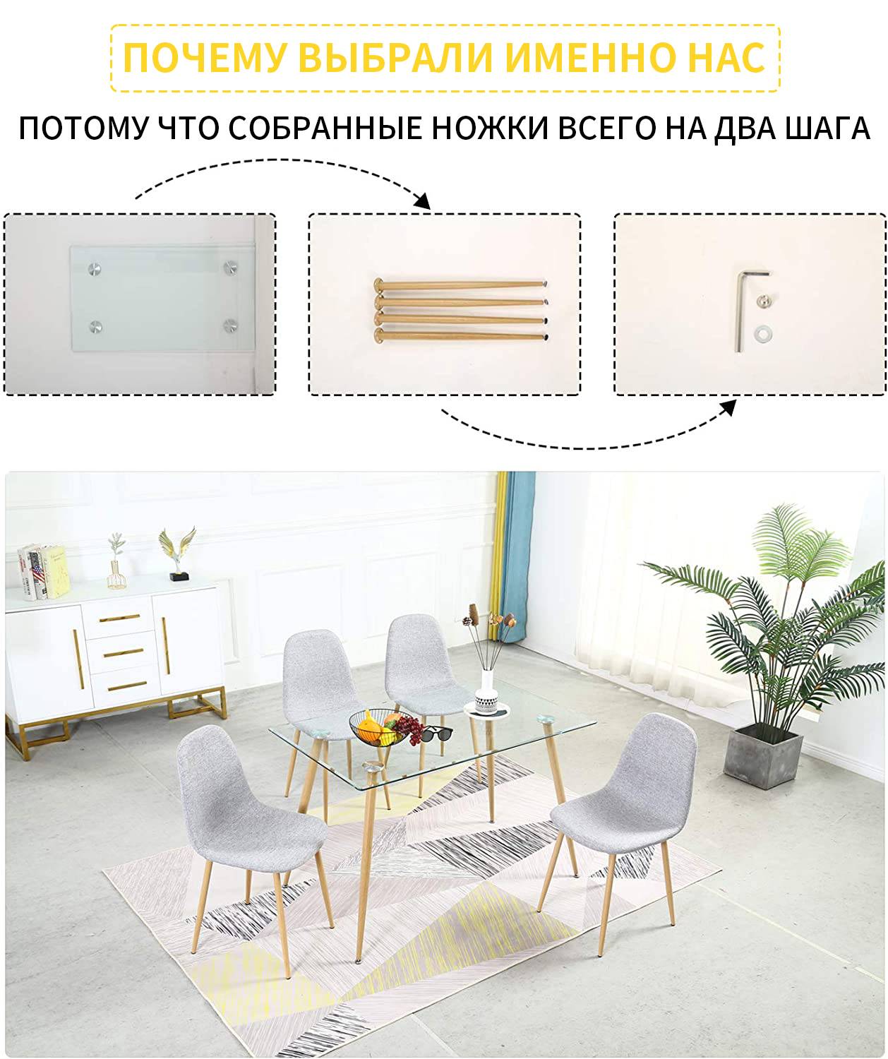 Современный и элегантный дизайн - Простой и современный дизайн соответствует простому отношению людей к жизни. Светло-серая обивка и дизайн прозрачной стеклянной столешницы обеспечивают шикарный и модный внешний вид. Прямоугольный обеденный стол и набор из 4 стульев привнесут элегантность в ваш дом.