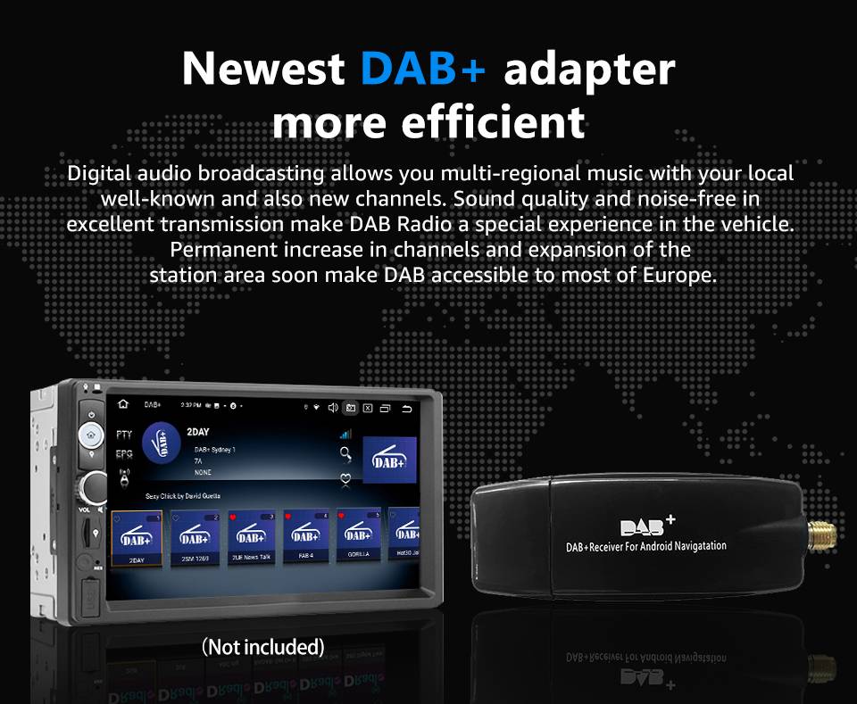 Цифровое аудио-вещание позволяет вам многоуровневую музыку с вашими местными известными и также новыми каналами. Качество звука и отсутствие шума в отличной передаче делают DAB Radio особенным опытом в транспортном средстве. Постоянное увеличение каналов и расширение площади станции в скором времени делают DAB доступным для большинства стран Европы.