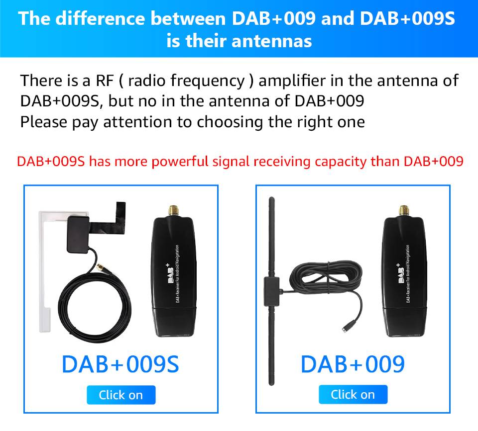 В антенне DAB + 009S есть Радиочастотный усилитель, но нет в антенне DAB + 009. Пожалуйста, обратите внимание на выбор правильного