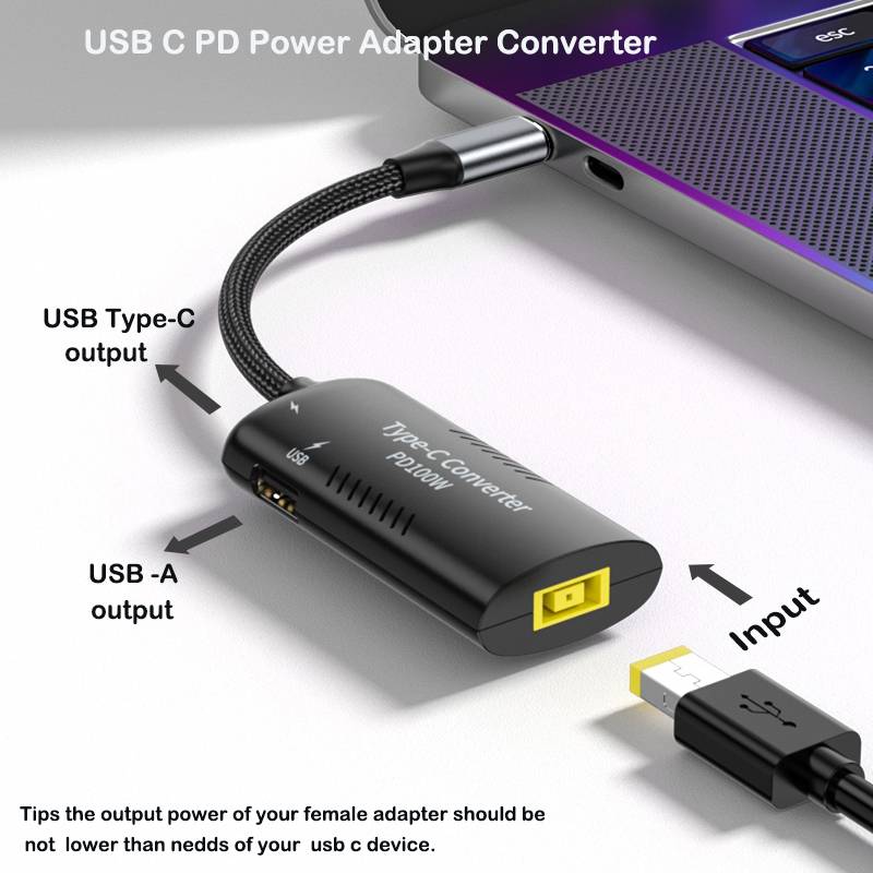 3. Женский (USB A): 5V@2.4A (поддержка нескольких протоколов зарядки USB) Только кабель преобразователя постоянного тока! Советы: Это конвертер штепсельной вилки адаптера через 4 заглушка адаптера ноутбука с разъемом USB Type C. Вам нужен один адаптер для ноутбука. Адаптер ноутбука должен иметь достаточно мощности для зарядки устройств USB Type C. Мы предлагаем вам выбрать адаптер для ноутбука 100 Вт или 90 Вт, это будет лучше. Такие как 19V 4.74A,20V4.5A,20V3.25A и т. Д. Если вы используете адаптер для ноутбука 100 Вт для его зарядки, выход usb c должен быть 100 Вт (макс.),