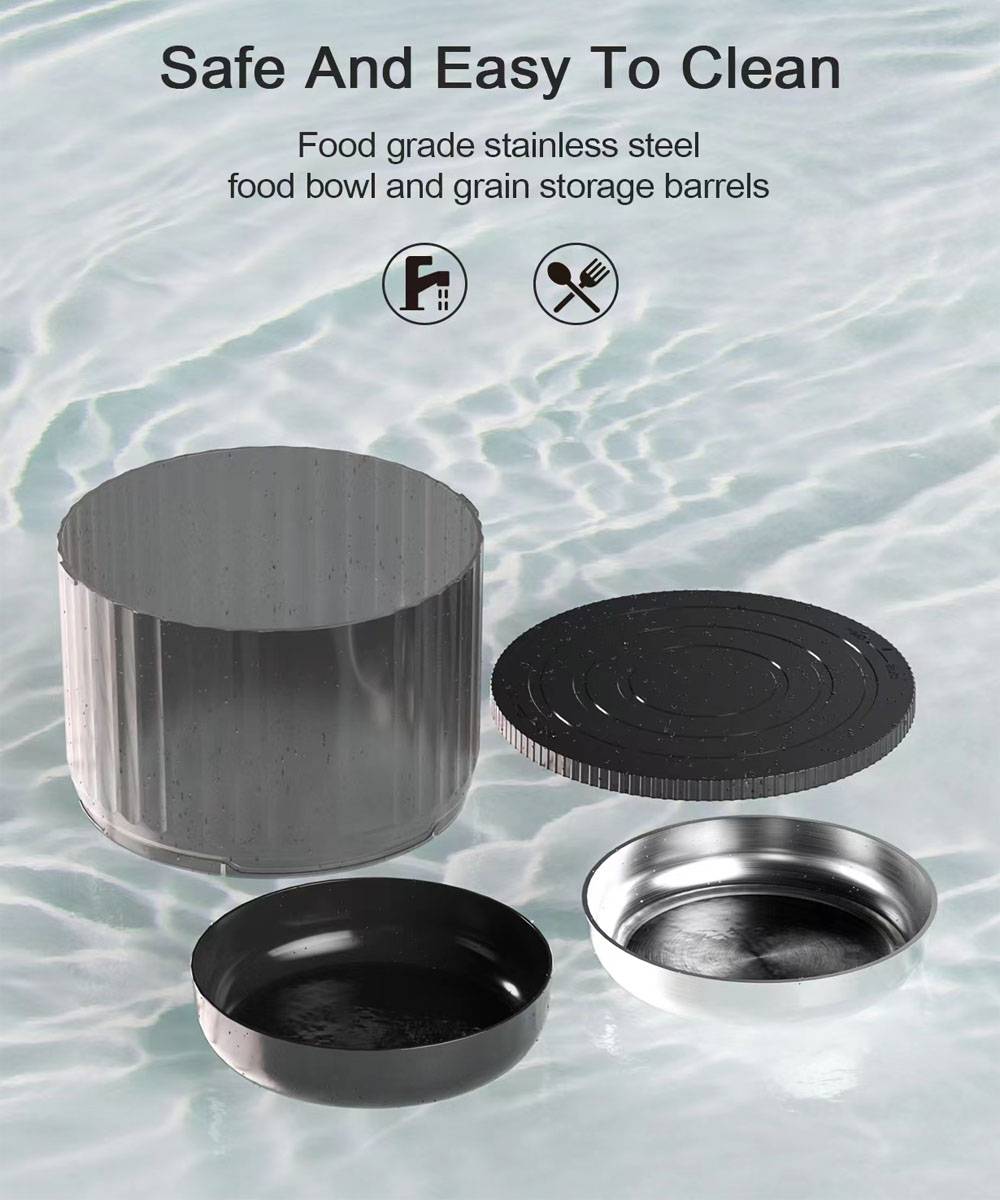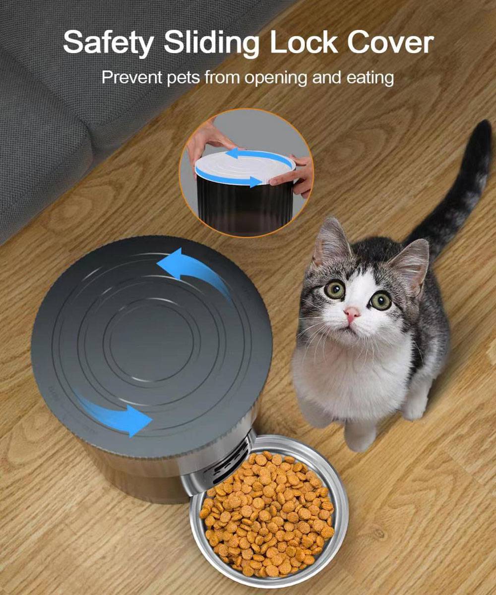【Настройка времени подачи и квантов】этот автоматический питатель для домашних животных обеспечивает гибкий размер еды, от 1 до 40 порций за еду, каждая подача составляет около 5g, а Емкость контейнера составляет 4л.