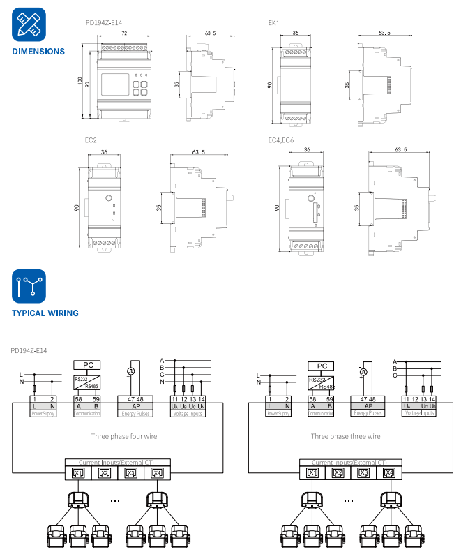 Монтируемый на рельсах многоконтурный измеритель мощности может измерять параметры многофазной или однофазной электросети, такие как напряжение, ток, мощность, частота, энергия, спрос, экстремальное значение, общее гармоническое искажение, 2nd-31st гармоника, напряжение и ток разбалансировка и многократное измерение электрической энергии. Максимальные измерительные схемы PD194Z-E14-четыре трехфазных или двенадцать однофазных схем. Счетчик принимает режим доступа внешнего трансформатора тока и модульный дизайн, который удобен для пользователя, чтобы выбрать различные функции, чтобы удовлетворить различные требования в поле.