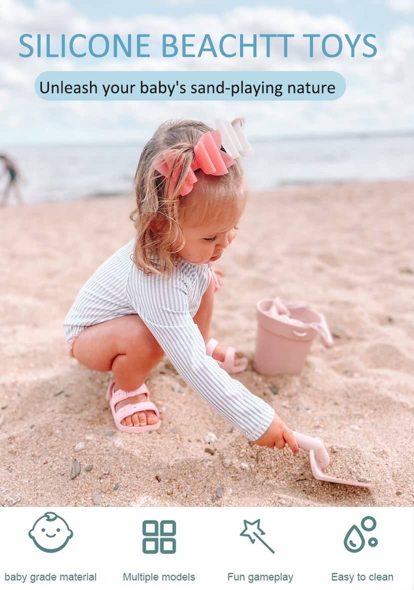 Идеальный комплект детских игрушек для пляжа, изготовленный из прочного силикона, поэтому он не сломается, как пластиковые пляжные наборы, и отлично подходит для путешествий, легкий и закатывается для легкой упаковки.