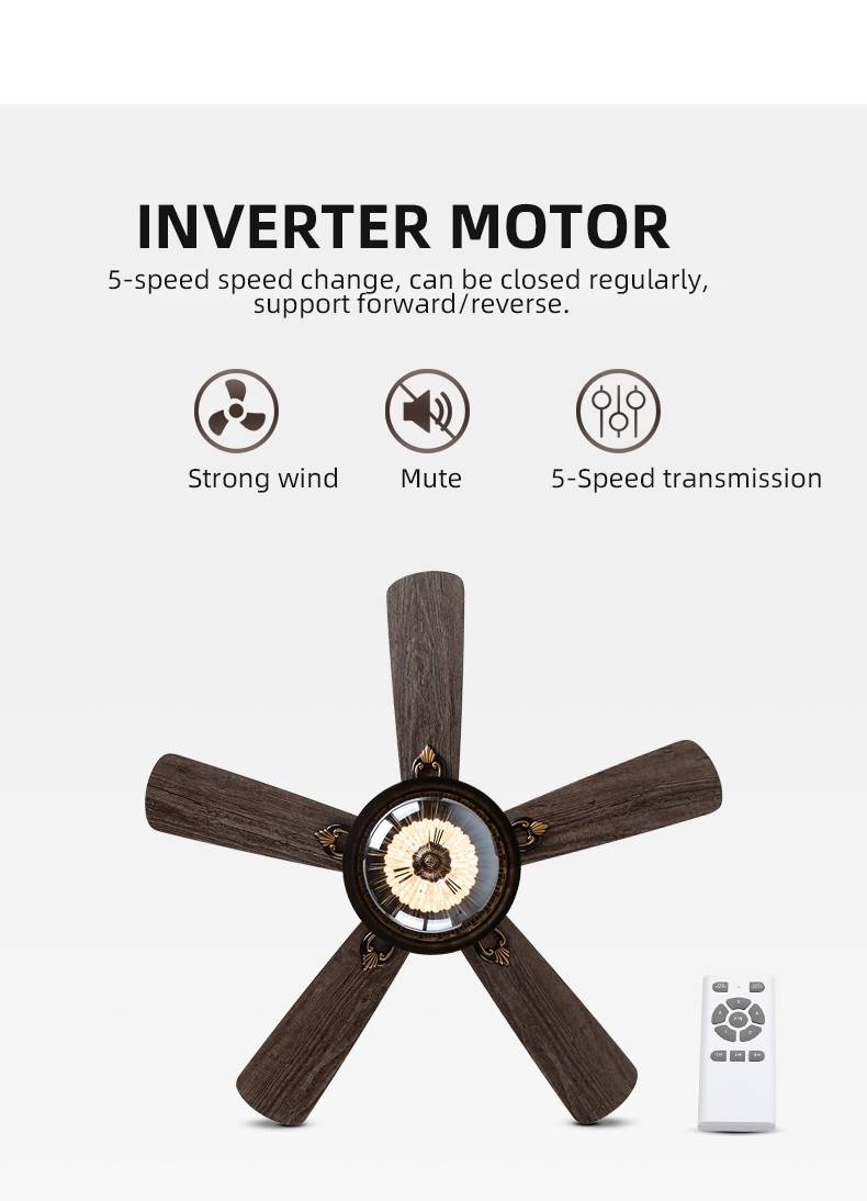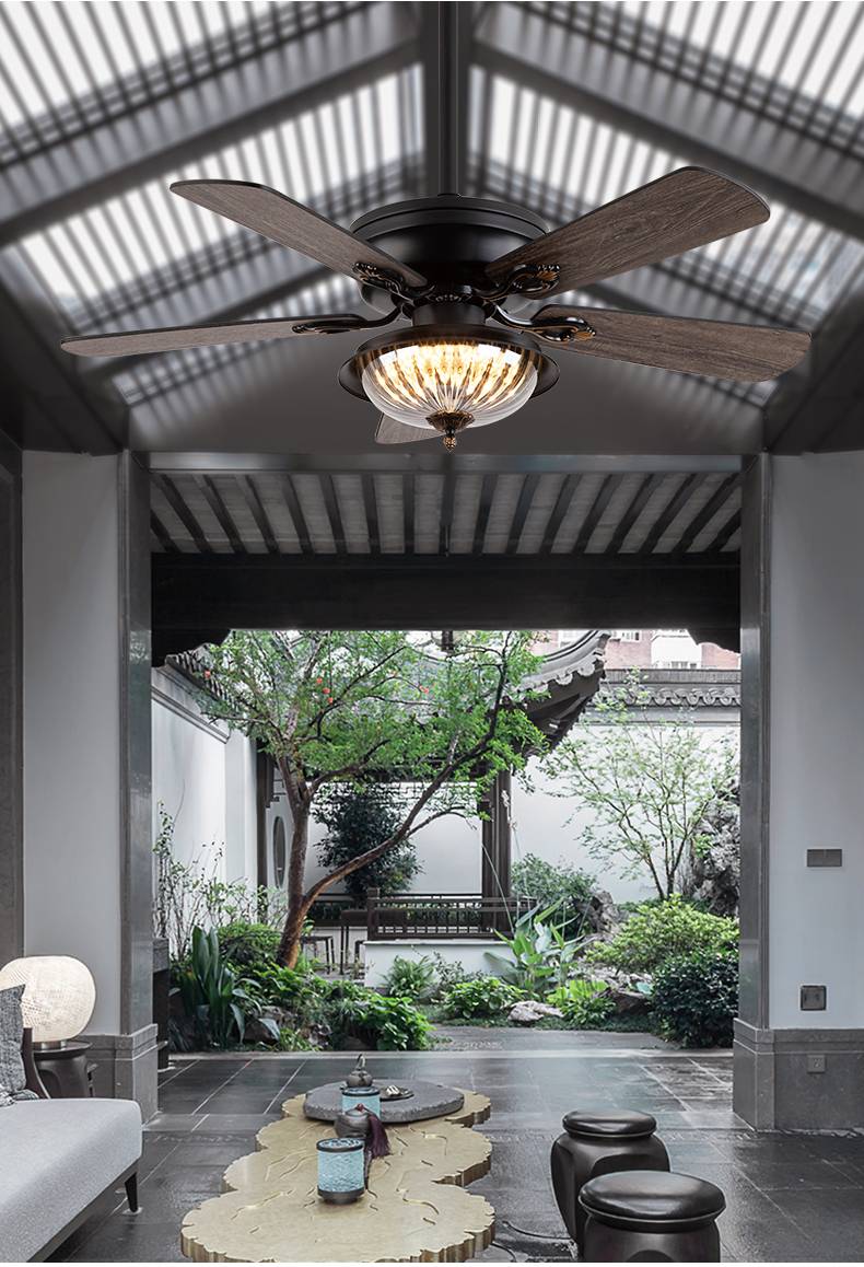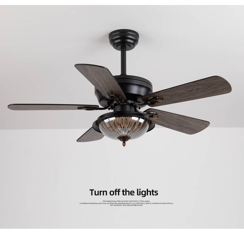 Материал корпуса лампы: кованое железо + стеклянный абажур + деревянный лопасть вентилятора