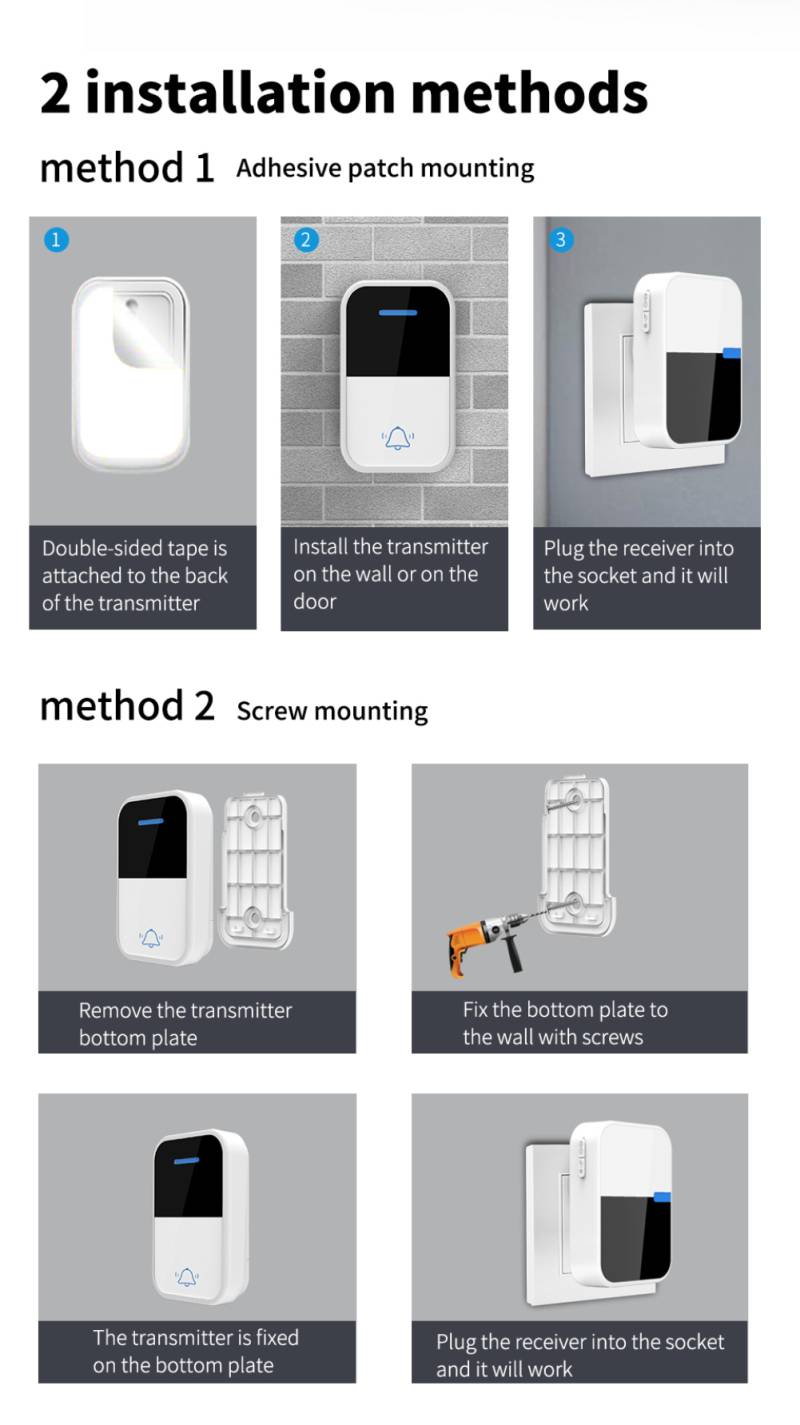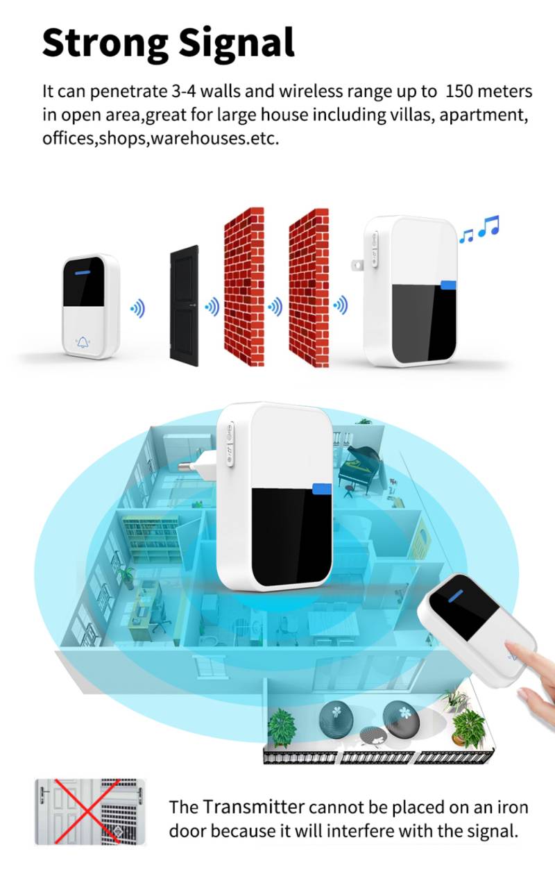 ✔Когда вы нажимаете на палец, кинетическая энергия будет преобразована в электрическую энергию, и беспроводной сигнал будет передан мгновенно, поэтому вам не придется беспокоиться об изменении аккумулятора для дверного звонка.