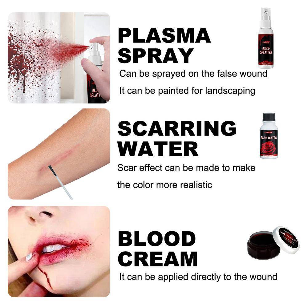 5. Идеальный подарок на Хэллоуин: в упаковке 1*30 г воска для кожи, 1*30 г поддельного геля для крови, 1*60 мл поддельный спрей для крови, 1*20 мл шрам для воды, 1 * двусторонний шпатель для помощи в нанесении воска, 3 * губки, идеальный макияж для Хэллоуина, чтобы помочь вам создать идеальный макияж для Хэллоуина.