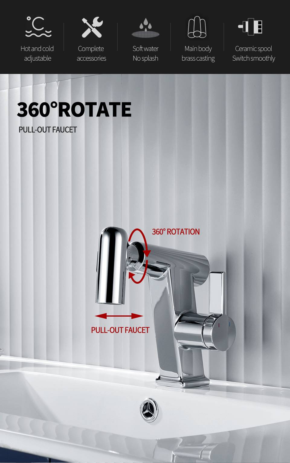Хромированный выдвижной смеситель для раковины, латунь, ванная комната, многофункциональный, 3 режима, распылитель, насадка для горячей и холодной воды, на бортике, смеситель для раковины