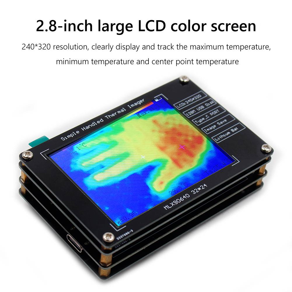 MLX90640 инфракрасные датчики температуры легкие 2,8 дюймовые цифровые тепловизионные камеры USB зарядка для промышленных компонентов Характеристика: 1. Отличный чип:Инфракрасный датчик, 32*24 пикселей Дальний инфракрасный массив, с четким отображением. Измерение в реальном времени, диапазон измерения от-40 ℃ до + 300 ℃, а частота динамического обновления-8 Гц. 2,8 дюймов Большой ЖК-дисплей цветной экран, 240*320 разрешение, четкого отображения и отслеживать Максимальная температура, минимальная температура и центральной точки температуры. 2. Материал:FR4 эпоксидный материал внешней оболочки используется для лучшей защиты внутренних компонентов и имеет длительный срок службы. Интегрированный дизайн, плавная работа без внешнего оборудования. 3. Хранение:Тепловизор оснащен чипом флэш-памяти SPI, который имеет функцию фотографирования и хранения фотографий, и может хранить до 99 фотографий. Через интерфейс передачи данных вы можете просматривать и Копировать Файлы изображений, подключив кабель передачи данных к компьютеру или мобильный телефон. 4. Питание от USB:Встроенный литий-ионный аккумулятор, USB Type-C дизайн зарядки, длительный срок службы батареи, поддержка зарядки при использовании. 5. Широко используется:Он интегрирует измерение температуры поверхности и функции тепловизионного изображения в реальном времени и применим как для обнаружения температуры человеческого тела, так и для промышленного определения температуры. Он небольшой по размеру, светильник по весу, удобно носить с собой и не занимает слишком много места. Спецификация: Название: тепловизор Материал: эпоксидная доска + печатная плата Батарея: 3,7 V 800 мА/ч, литий-ионный аккумулятор Батарея (все указанные аккумуляторы входят в комплект поставки) Инфракрасный датчик: MLX90640ESF-BAB Аппаратное Разрешение: 32*24 пикселей Дальний инфракрасный массив Разрешение экрана: 320*240 пикселей Диапазон измерения температуры: от-40 ℃ до 300 ℃ Точность измерения: ± 2 ℃ Рабочая температура: от 0 до 50 ℃ Рабочая влажность: ≤ 70% Частота обновления: 8 Гц Поле зрения: горизонтальный 55 ° * 35 ° по вертикали Излучение: 0,95 Характеристики зарядки: USB Type-C5V/1A Время работы: ≥ 4 часа Размер: около 85x55x2 0 мм/3.34x2.16x0.78inch Широко используется: 1. Высокоточное Бесконтактное измерение температуры и обнаружение температуры тела. 2. Интеллектуальное измерение и контроль температуры окружающей среды здания. 3. Осмотр технического обслуживания транспортного средства и определение температуры деталей транспортного средства. 4. Обнаружение и контроль температуры микроволновой печи и микроволновой печи. 5. Контроль температуры промышленных компонентов. 6. Визуальный датчик температуры. 7. Утечка и техническое обслуживание оборудования для напольного отопления. 8. Тепловая проверка монтажных плат и компонентов. Примечание: