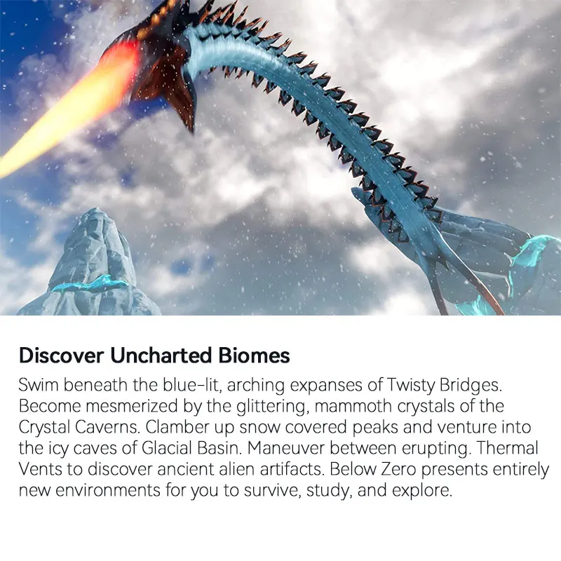 Плавайте под синим освещением, выгнутыми просторами скрученных мостов. Завораживаются сверкающими, мамонтовыми кристаллами хрустальных каверн. Поднимите снежные покрытые вершины и погрузитесь в ледяные пещеры ледникового бассейна. Маневрируйте между извержением тепловых вентиляторов, чтобы обнаружить древние Инопланетные артефакты. Ниже нуля представлены совершенно новые условия для выживания, учебы и изучения.