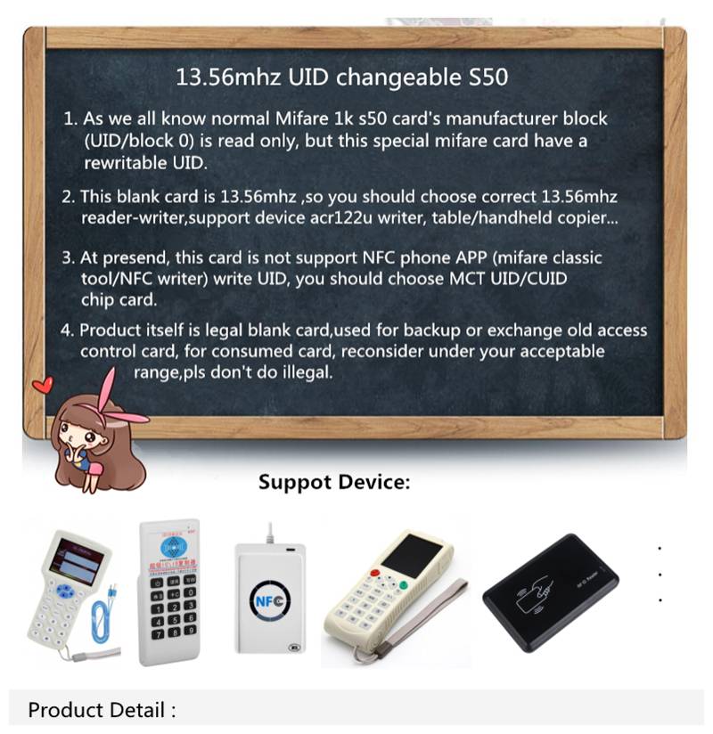 Эта UID карта работает так же, как обычные IC карты, для Mif 1K S50 стандарт. На любой UID, который вы хотите, можно запрограммировать только секторный 0 блок, известный как серийный номер/блок производителей (Chip UID).