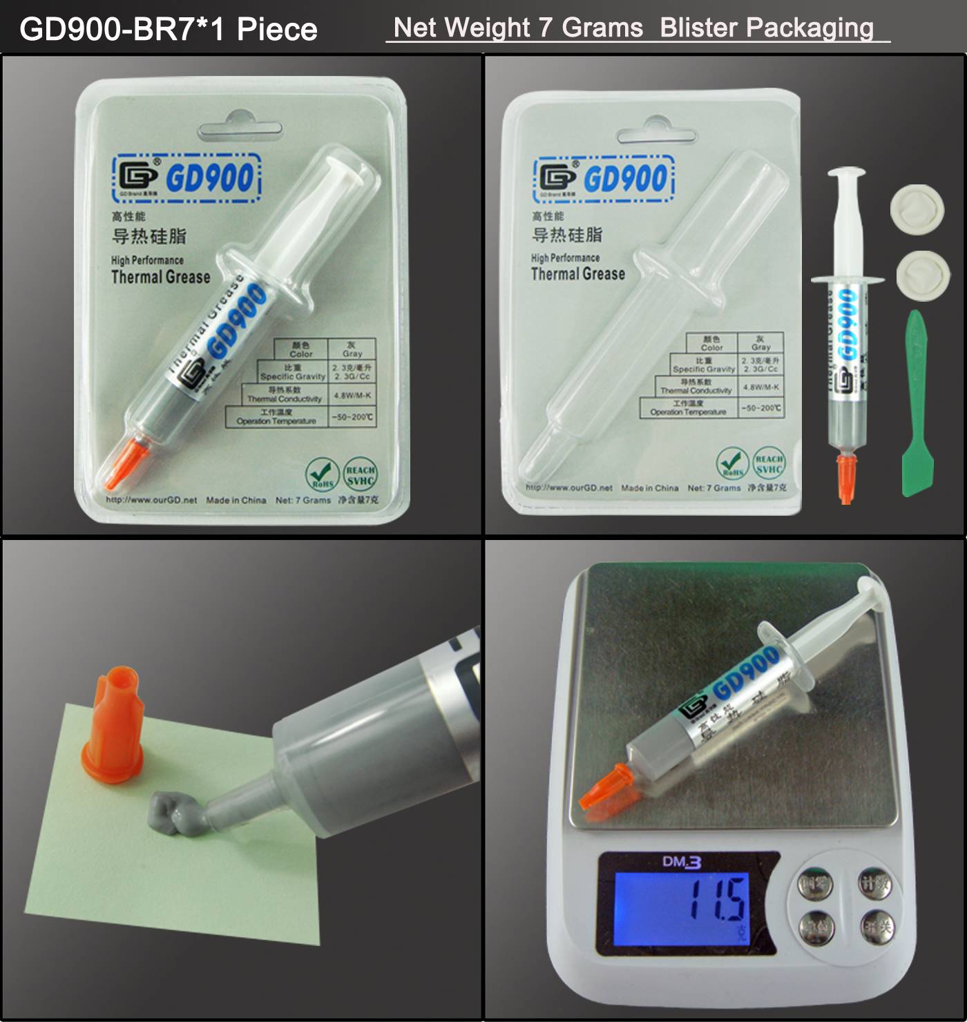 GD900 Тепловая паста выбирает гораздо более крошечные частицы диаметром оксида металла в качестве основного сырья, используется для заполнения зазора между источником тепла и устройством теплоотвода. Его Выдающаяся производительность на CPU GPU светодиодный процессор удовлетворит ваши высокие стандартные требования к системе охлаждения.