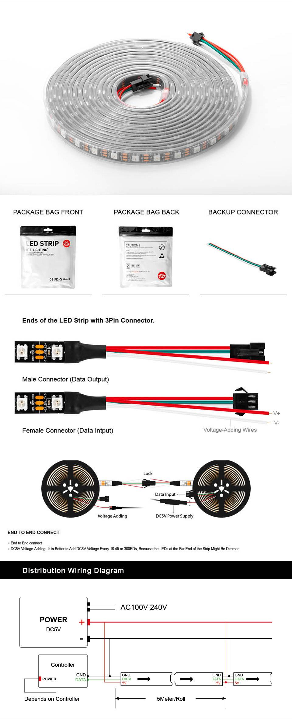 1. ЦенаТолько Светодиодная лента, Не включает блок питания и светодиодный контроллер.2. Необходимо использовать WS2812BDC5V источник питанияИСветодиодный контроллер пикселейДля контроля.3. Каждые 0,5 метра сПаяльные соединения, Это очень нормально в электронном продукте, это не проблема качества.4. WS2812B Светодиодная лента может быть разрезана между каждым светодиодом для создания пользовательских длин, пожалуйста, не сгибайте светодиодную ленту резко.5. 3-контактный JST разъем светодиодной ленты включает: Красный: VCC, Withe: GND, Зеленый: DATA.6. Светодиодная лента имеет клейкую ленту на задней части печатной платы (За исключениемIp67 ). Убедитесь, что поверхность установки должна быть гладкой, чистой и сухой.7. Более длинная Светодиодная лента работает, пожалуйста, Питание от 2 pin провода питания обоих концов, чтобы уменьшить падение напряжения.Как выбрать светодиодный блок питания и контроллер пикселей?Во-первых, рассчитаны все светодиодные полосы ватт.Один чип светодиодный составляет около 0,3 Вт, если вы покупаете 5 м 60 светодиодный s/m (всего светодиодный полоса составляет 300 светодиодный s ), поэтому 0,3 Вт * 300 = 90 Вт.Затем выберите правильный Светодиодный источник питания.Эта Светодиодная лента работает с мощностью 5 в пост. Тока, поэтому 90 Вт/5 В = 18 А (не менее 18 А или более).Наконец, выберите подходящий контроллер пикселей, который вам нравится.Светодиодная лента WS2812B управляется одним контроллером линии передачи данных.Таким образом, вы можете выбрать их из нашего магазина, у нас есть ИК/РЧ пульт, Bluetooth, Wifi, музыкальное приложение и компьютерный контроллер и т. д. (если вы не можете их распознать, вы можете связаться с нами, мы будем рады Вам помочь)Белая печатная плата/черная печатная плата.