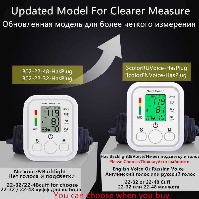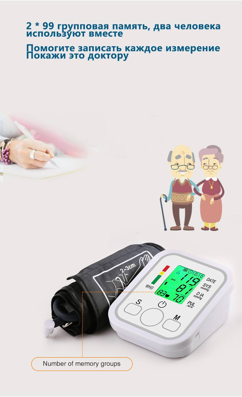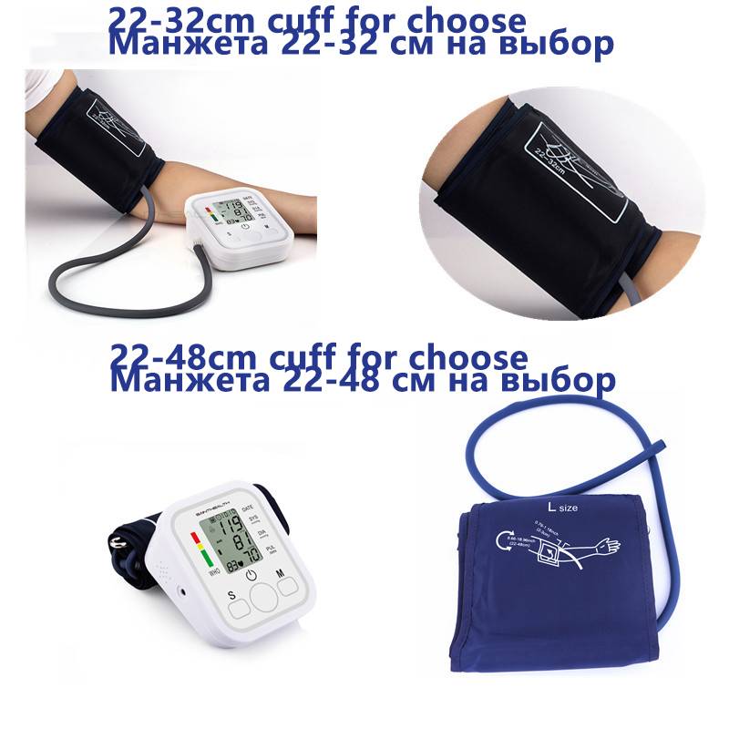 Информация о товаре: Имя: Монитор артериального давления в верхней части руки Производитель: Saint Health Размер: 126 мм (L) * 100 мм (W) * 53 мм (H) Артериальное давление: 20-280 мм рт. Частота пульса: 40-165 раз / мин Память для хранения: двойная 99 групповая память Герметизация: автоматический режим герметизации Размер манжеты: 22-32 см или 22-48 см на выбор Питание: батарейки типа AAAA (не входят в комплект) / зарядка через usb Адаптер: в комплекте. Адаптер для евро, США, Австралии и Великобритании будет отправлен в зависимости от страны. Подсветка: 3 цвета подсветки на выбор Голосовая функция: английский или русский голос на выбор Что значит подсветка? Значит, при измерении всегда есть подсветка. Таким образом, вы можете четко видеть экран даже в темноте. И увидеть более ясно в дневное время. Кроме того, если у вас высокое кровяное давление, экран будет красным. если у вас немного повышенное артериальное давление, экран будет желтым. Если ваше кровяное давление в норме, экран станет зеленым. По сравнению с моделью без подсветки, легче увидеть результат, особенно пожилым людям. Что такое английский голос и русский голос? Это означает, что на протяжении всего измерения у него есть живой английский или русский голос. Он расскажет нам, как проводить измерения и результат. Если не хотите голос, его тоже можно выключить. При заказе выберите, пожалуйста, вам нужен английский или русский голос. Модель: 3colorRuVoice означает 3-цветную подсветку и русскую озвучку. Модель: 3colorRuVoice-22-48 означает 3-х цветную подсветку и русский голос, а манжета большая. Модель: 3colorENVoice означает, что он имеет 3 цвета подсветки и английский голос Модель: 3colorENVoice-22-48 означает, что он имеет 3-цветную подсветку и английский голос, а манжета - большая манжета. У какой модели есть подсветка и голос? При заказе название модели с 3цветом имеет подсветку и озвучку. 3colorRuVoice означает Русский Голос. 3colorENVoice означает английский голос. Название модели без 3-х цветов не имеет ни подсветки, ни голоса. Затем вы выбираете, вам нужна большая или обычная манжета. Название модели с 22-48 - большая манжета. Преимущество бренда Saint Health: 1; Мы продаем этот продукт в Китае более 15 лет, и это действительно здорово! Это известный китайский бренд, золотое качество! Мы продаем на Aliexpress более 7 лет. 2; Теперь модернизируем товар! Мы предоставляем 3 цветовые модели с подсветкой и русским или английским голосом на выбор. 3; Мы предоставляем инструкции на русском языке для русскоязычных стран и предоставляем адаптеры, такие как адаптер для евро, адаптер для Великобритании, США и Австралии. 4; Мы также добавили вариант с большой манжетой 22-48 см для тех людей, которым нужен тонометр с манжетой большого размера, чтобы следить за своим здоровьем. Для нас очень важно здоровье! И хороший томомер очень поможет! Подарите нашим близким!