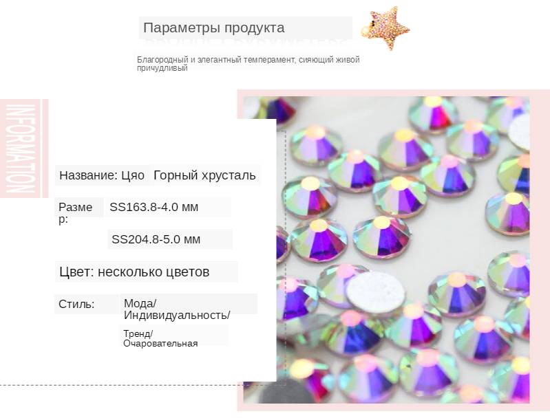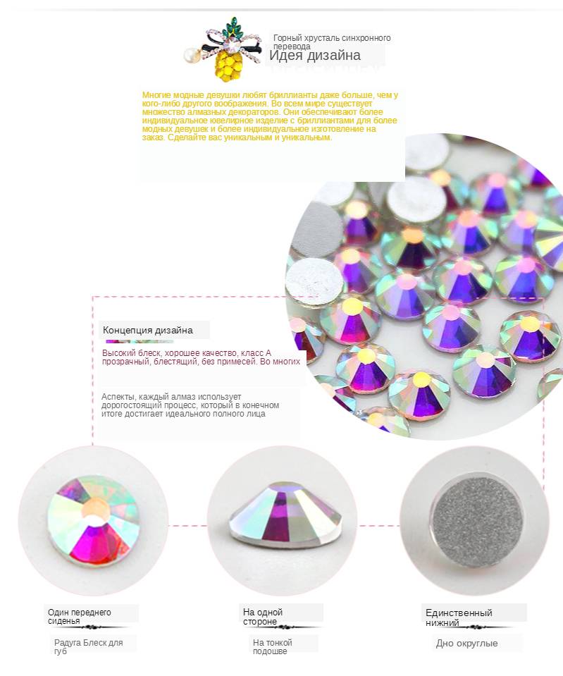 Цвет: кристалл AB/прозрачный AB Упаковка: бумажная упаковка Использование: украсьте свой телефон, Нейл-арт, карточный крафт, обувь, свадебное платье, книги, гитара, планшеты, автомобильные тарелки, разброс стола и так далее Примечание: ссылка на этот продукт-это необходимость использования клея (Клей не входит в посылка) Наш магазин разделен на два вида Стразы: 1. Стразы без горячей фиксации 2. Стразы горячей фиксации/железо на камне Для упаковки продукта и любых требований, вы можете связаться со мной