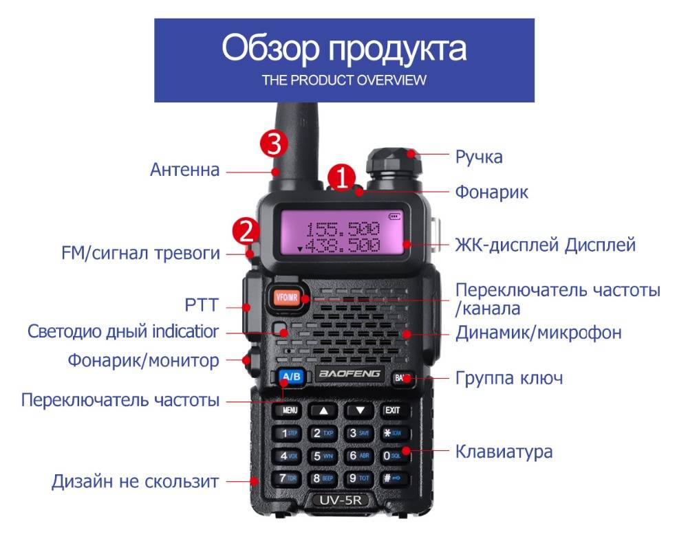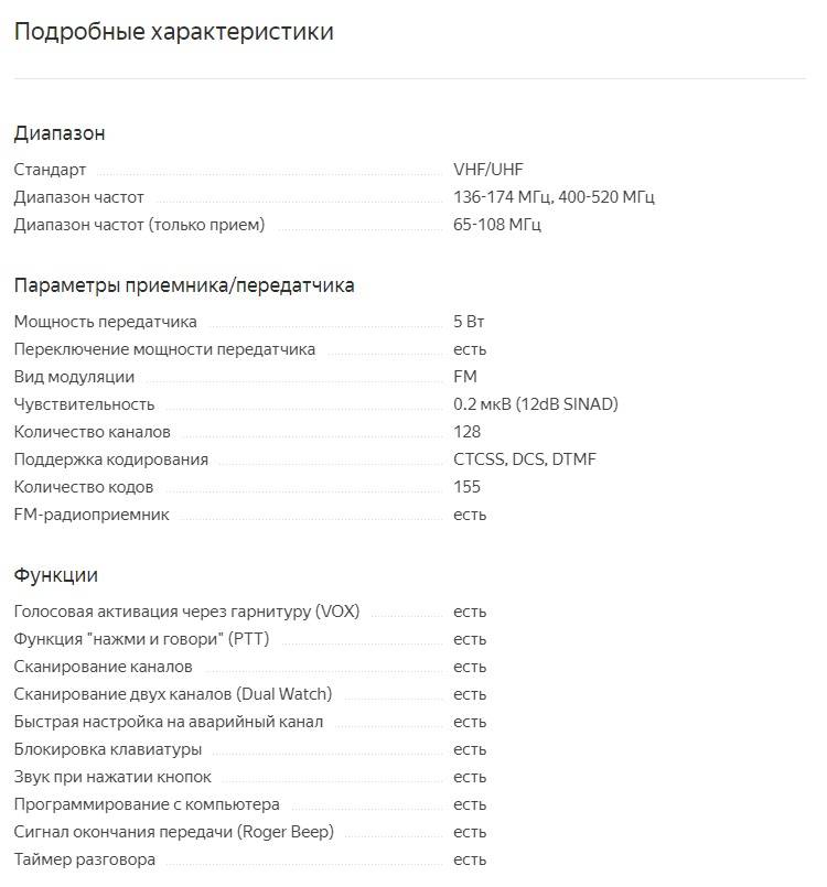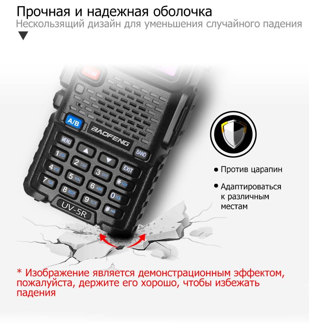 Главная особенность: -Длительный износостойкий, чувствительный и прочный -Экологическая защита ПК -Резиновая клавиатура -Диапазонный портативный приемопередатчик с функцией дисплея -Коммерческий FM-радиоприемник (65 МГц-108 МГц) -Встроенный светодиодный фонарик -Встроенный RX CTCSS / DCS сканирование -Функция VOX -Сигнализация -Широкополосный / узкополосный по выбору -Функция звукового сигнала на клавиатуре -Двойные часы / двойной прием -Диапазонный прием / передача -Функция экономии батареи Пакет включает в себя: -1 х Портативный Радио UV5R -1 х антенна -1 х литий-ионный аккумулятор -1 х LI-ионное зарядное устройство -1 х зажим для ремня -1 х слинг -1 х Руководство пользователя -1 х микрофон