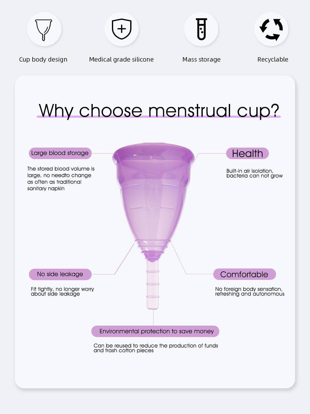 5. Менструальные чашки должны быть стерилизованы перед использованием, можно выбрать специальный Стерилизатор Дезинфекции, также может быть в кипящей воде дезинфекции