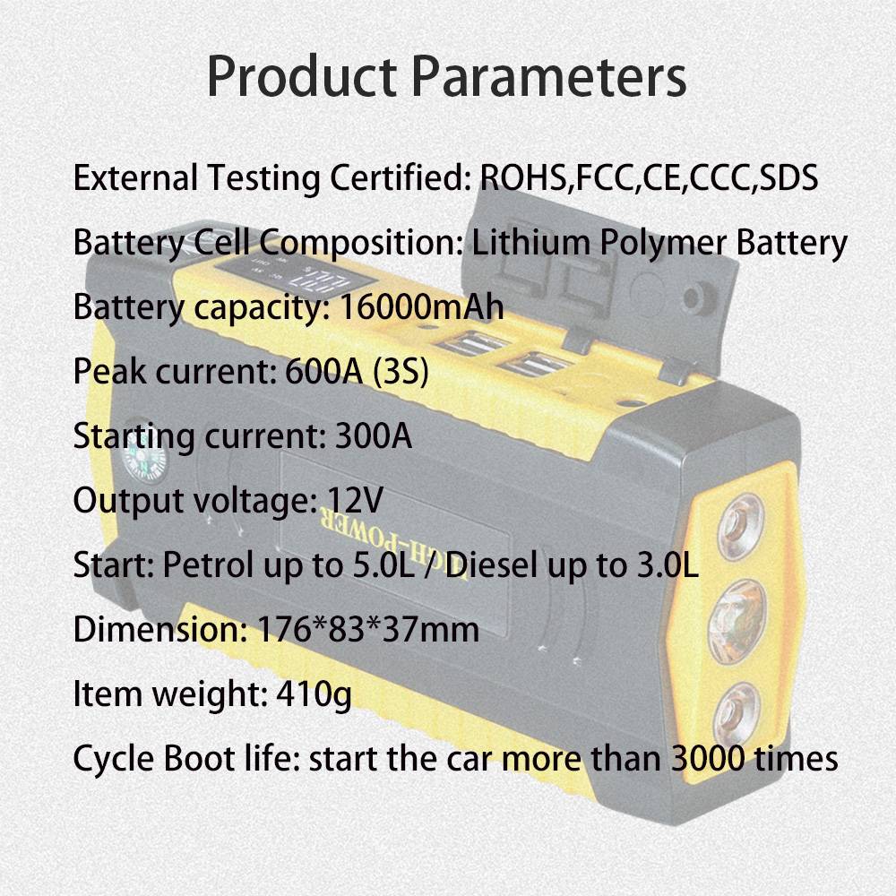 Высокая мощность автомобиля скачок стартерБыстрый запуск 12V бензиновый автомобиль (до 5.0L) и дизельный автомобиль (до 3.0L) только за считанные секунды в тех случаях, когда автомобильного аккумулятора. Когда вы путешествуете в какой-то непроходимом месте, и ваш автомобильный аккумулятор выходит за пределы питания, вы можете использовать этот автомобиль скачок стартер для запуска вашего автомобиля.