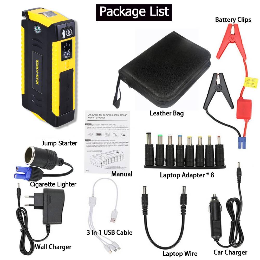 Автомобиль скачок стартер (Power bank) * 1Зажимом батареи (красный = Положительный; Черный = отрицательный) * 1Настенное зарядное устройство * 1Автомобильное зарядное устройство * 13 in1 зарядный кабель * 1Разъем для ноутбука * 8Ноутбук кабель для зарядки * 1Инструкция на английском языке * 1Розничная продажа, кейс для инструментов * 1Зажигалка стартер в подарок * 1
