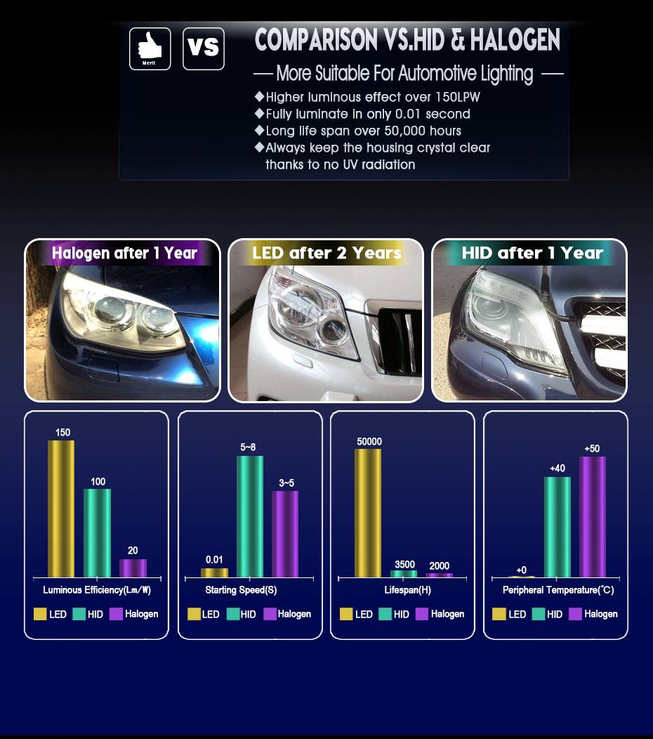 Light source: 4pcs LED chips for single beam (Special for automobiles),6pcs LED chips for bi beam
