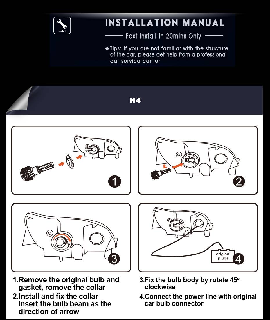 After you install our LED lights, if the below issues happen, include both of light bulbs flicker, warning error on the PC board, both of lights can not bright up, one or two bulbs light up for a while then off suddenly, bulb has dim lights after you trun off the lights botton, the original DRL or Side parking light can not light up after you trun on the headlight bulbs. These issues indicate you that our bulbs can work well, you just need LED decoder or LED resistor to fit your car headlights. Please do not worry. You can contact us or you can clickHEREto buy LED decoders.