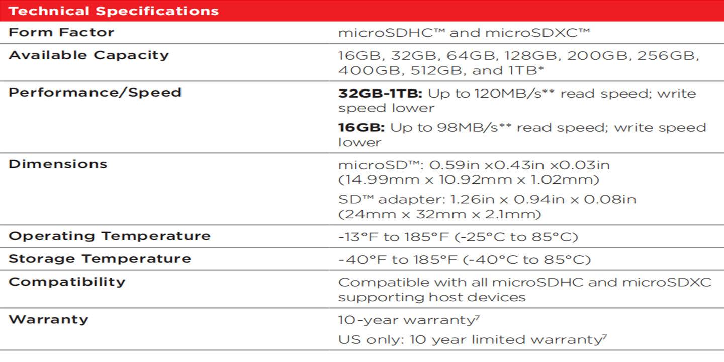 [Для 32 ГБ-1 ТБ] скорость чтения до 120 Мб/с, разработанная с собственной технологией для достижения скорости выше UHS-I 104 Мб/с, требуют совместимых устройств, способных достичь такой скорости. Скорость записи ниже. На основе внутреннего тестирования; Производительность может быть ниже в зависимости от хост-устройства, интерфейса, условий использования и других факторов. 1 Мб = 1000000 байт. [для 16 Гб] скорость чтения до 98 Мб/с; Скорость записи ниже. На основе внутреннего тестирования; Производительность может быть ниже в зависимости от хост-устройства, интерфейса, условий использования и других факторов. 1 Мб = 1000000 байт.