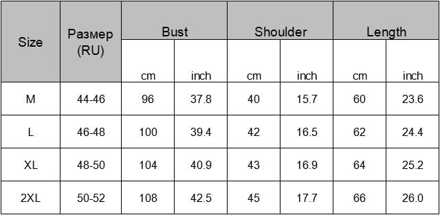 Пожалуйста, обратите внимание, если вы не уверены в размере, пожалуйста, оставьте нам сообщение о вашем весе, росте и обхвате груди, для вас будет предложен размер. Пожалуйста, учитывайте погрешность в 2-3 см, связанная с особенностями как замеры могут сниматься разными.(1 дюйм = 2,54 см 1 см = 0,39 дюйма)