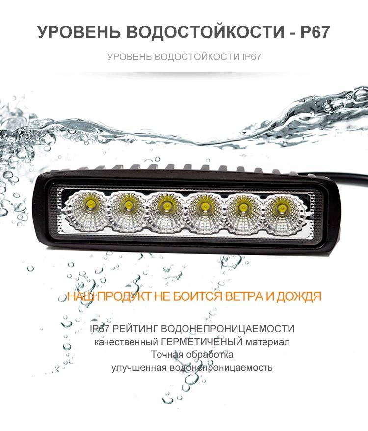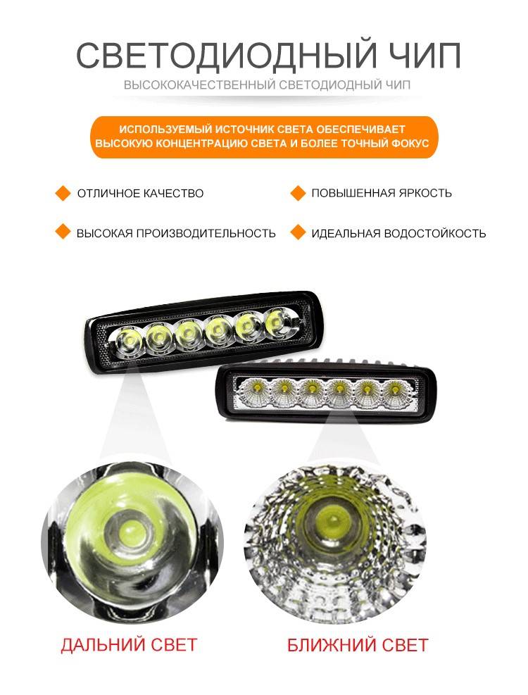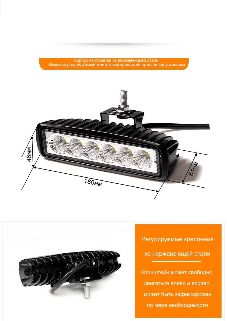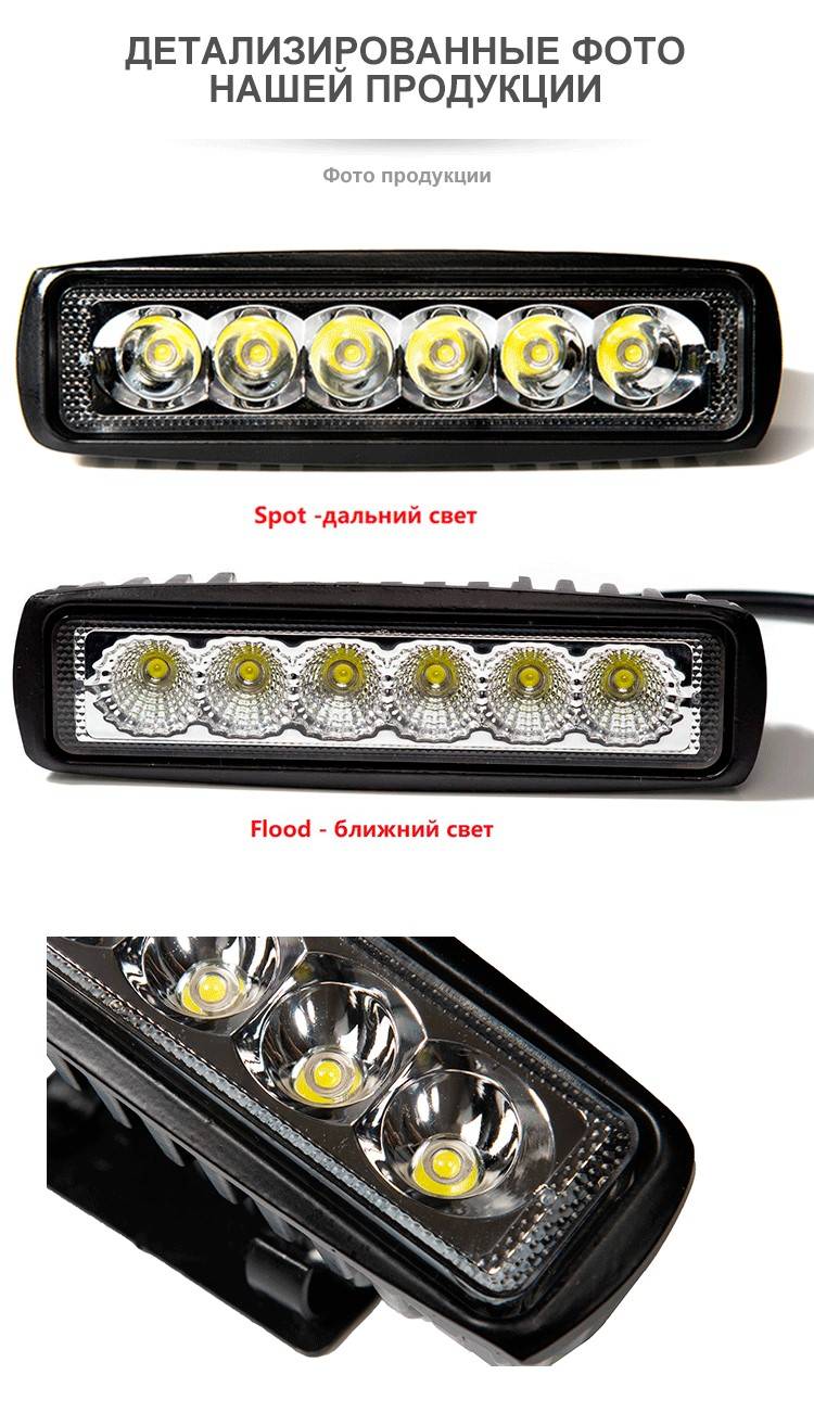 Дневные Ходовые Огни Для Авто Противотуманные Фары Светодиодная Балка Лампа Для Лада Гранта Внедорожных Грузовиков Автобус Лодка Дхо Для Автомобилей Сборка ATV Tракторный Прицеп Для Лада Нива 4x4 УАЗ КИА РИО 3 Технические характеристики: ● 6 высококачественных светодиодов по 3 Вт; ● Узор луча: поток или точка ● Напряжение: 12-24 В; ● Цветовая температура: 6000 K-6500 K; ● Водонепроницаемость: IP 67; ● Диапазон рабочих температур: от-40 до + 50 ° С; ● Материал корпуса: алюминиевый сплав; ● Цвет корпуса: черный. Разница между потоком и пятном: ● Точка имеет узкий луч, который концентрирует свет в небольшой области. ● Поток имеет широкий луч и он сконструирован таким образом, чтобы свет распределился по более широкой области, но на меньшем расстоянии ● На месте вы увидите вещи, которые находятся вдали от вас. В свою очередь, поток позволит вам лучше видеть вещи на коротком, но более широком расстоянии. ● Потому что свет более концентрирован, пятно будет ярче, чем поток, но только в пределах его более узкого луча. Место больше подходит для осветительных объектов, а поток больше подходит для осветительных зон. Применение: Светодиодный фонарь предназначен для установки на автомобили, внедорожники, грузовики, квадроциклы, мотоциклы и сельскохозяйственная техника, водный транспорт (лодки и т. д.), и так далее. Они могут использоваться в качестве дневных ходовых огней и в качестве дополнительной молнии. Если у вас есть источник питания с напряжением 12-24 В лампа используется для уличного освещения. Преимущества светодиодный фары: ● Повышение безопасности. Дополнительный свет в ночном путешествии по непривычной местности является чрезвычайно важным выбором. ● Экономия. Светодиодный элемент отличается низким энергопотреблением по сравнению с другими типами ламп. Они практически не создают дополнительной нагрузки на проводку и генератор и не влияет на расход топлива. ● Простая установка. Благодаря самой упрощенной конструкции крепежных элементов вы не будете иметь проблем с установкой фар и регулировкой направления светового потока. ● Надежность. Корпуса фар изготовлены из алюминиевого сплава, что позволяет им справляться с высокими механическими нагрузками. Светодиодный-элементы защищены ударопрочным акриловым стеклом. В связи с его устойчивостью к экстремальным температурам и осадкам фары могут использоваться в любых погодных условиях. ● Срок службы. Для продления срока службы наших фар мы специально используем 70% мощности светодиодов. Наши преимущества: ● Собственного производства. Мы работаем напрямую от производителя без посредников.
