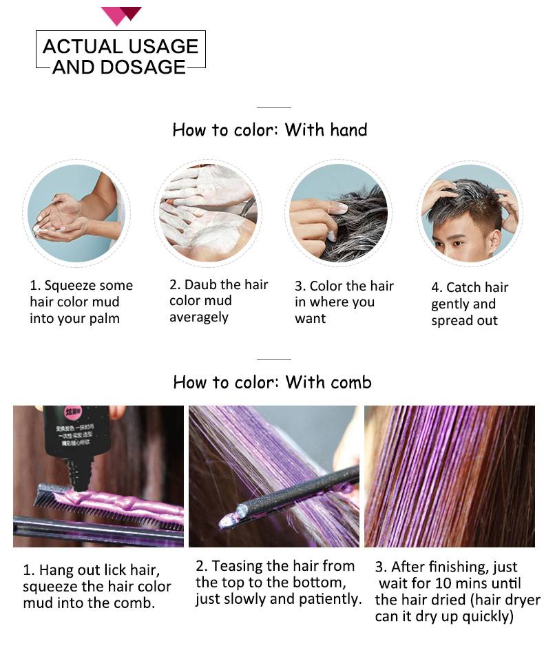 1. Выдавите цветную грязь в ладонь 2. Мазать Волосы грязи в среднем 3. Цвет волос в том месте, где вы хотите 4. Аккуратно Доработать дизайн * Вы также можете использовать расческу для чистки волос