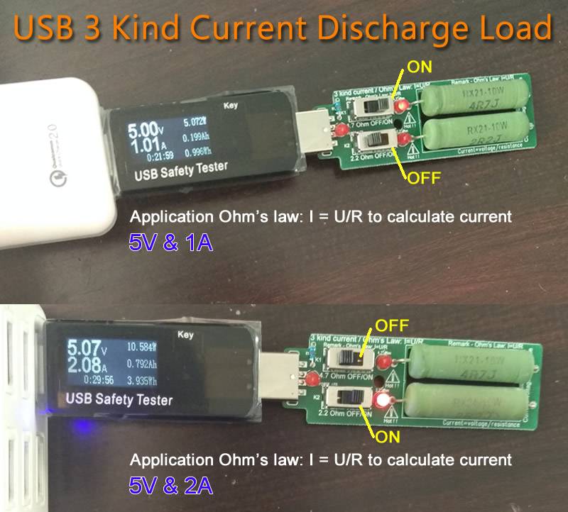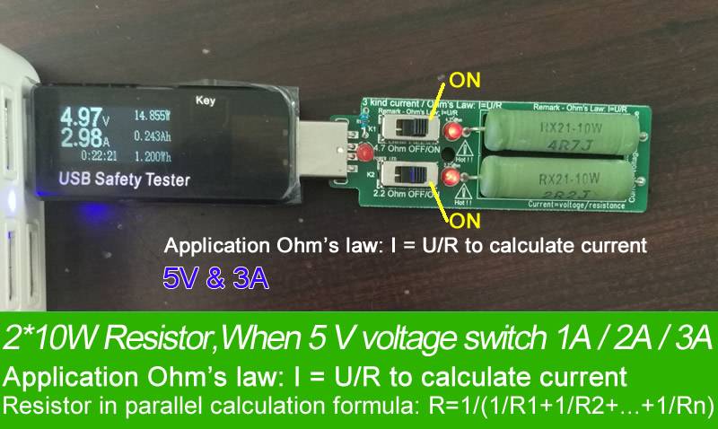Спроектированный в соответствии с правилами Ом и через резистор параллельно через другой переключатель, может производить 3 вида сопротивления нового USB электронного сопротивления нагрузки разряда, когда весь переключатель открывается, это 2,2 Ом/10 Вт, 4,7 Ом/10 Вт, 2 вида сопротивления одновременно, В напряжении 5 в почти может производить ток разряда 3а. Фактический текущий размер, пожалуйста, согласно законам Ома: I = U/R Формула параллельного вычисления резистора: R = 1/(1/R1 + 1/R2 +...+ 1/Rn) K1 = 4.7Ohm/10 Вт, K2 = 2.2Ohm/10 Вт