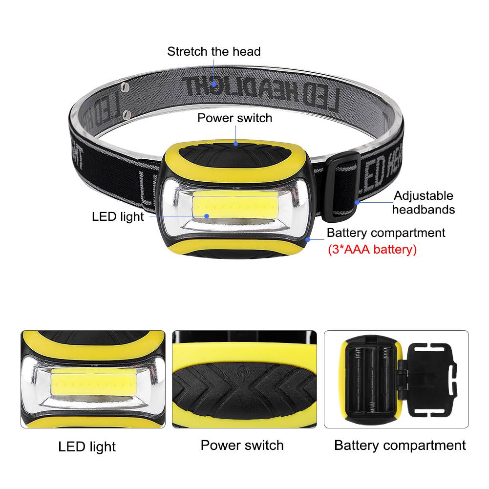 Характеристика: Мини-фары весом всего 49 г, легко носить с собой. 1 COB светодиодный для обеспечения сильного, чистого освещения. 4 режима: сильный, слабый, вспышка, SOS (Длительное нажатие на выключатель 3 секунды, введите SOS) Материал: ПВХ Источник питания: 3 батарейки AAA (не входят в комплект) Посылка включает в себя: 1 * мини COB светодиодный налобный фонарь