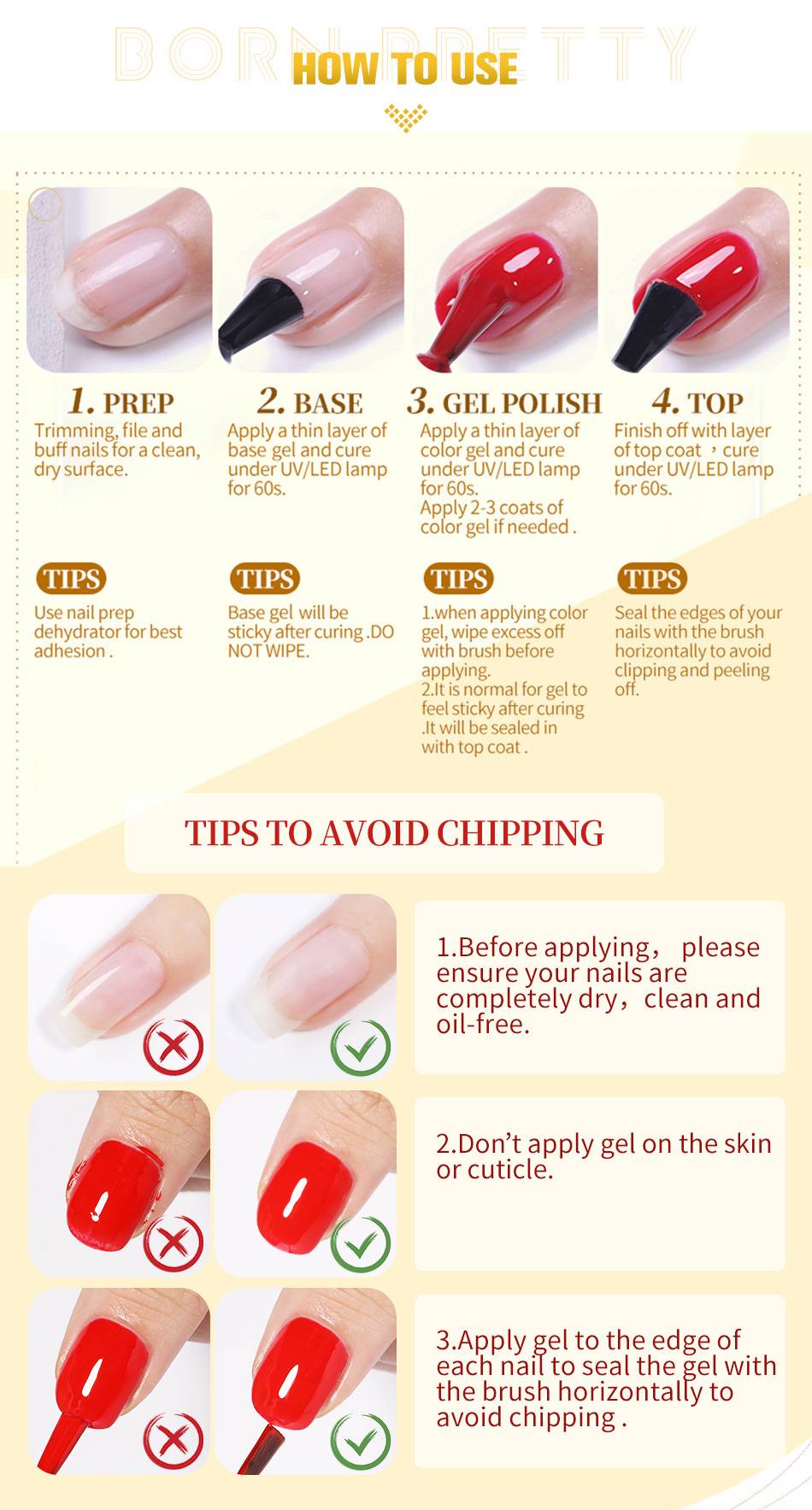 Step 3. Apply Base Gel first,which can make polish lasting longer, cure with UV lamp or LED lamp. (Necessary)